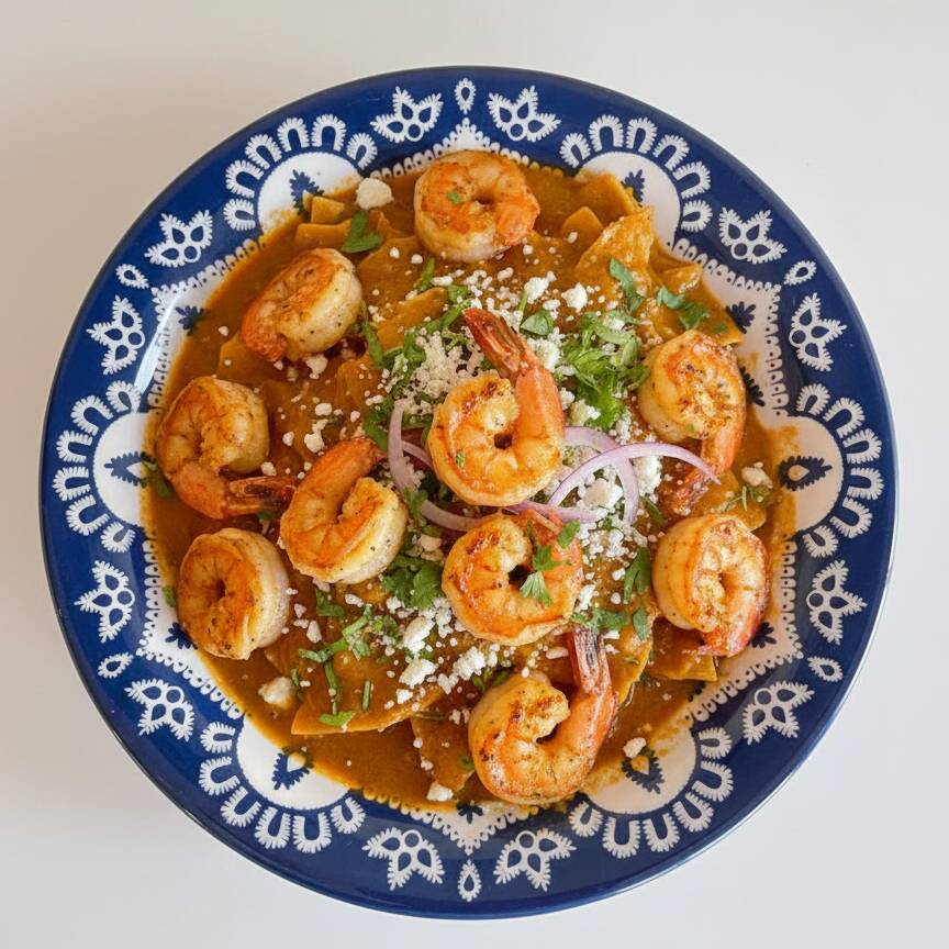 Deliciosos chilaquiles en crema de chipotle con camarones salteados 120gr.