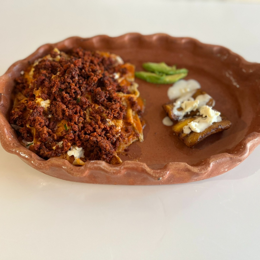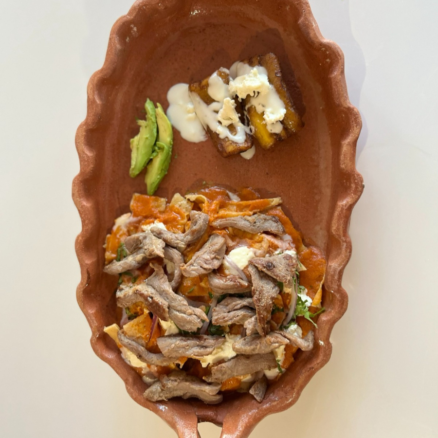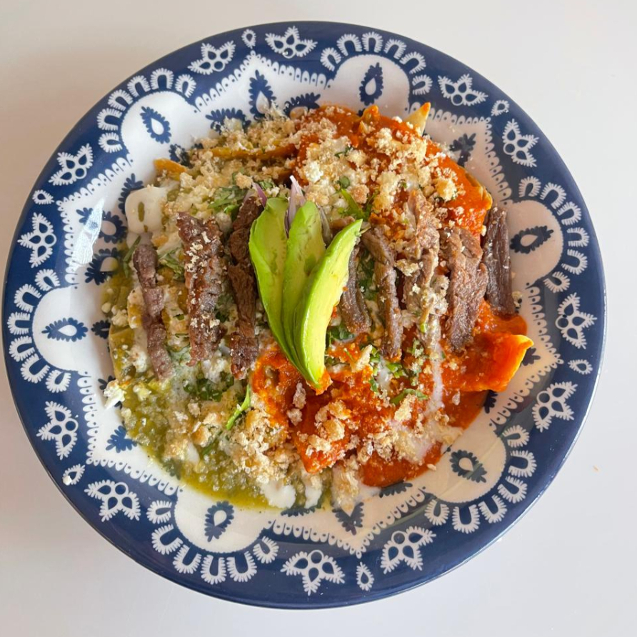 Deliciosos chilaquiles en salsa verde y roja con arrachera 120gr., y un toque de chicharrón