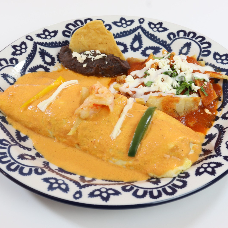 Relleno de camarones 120gr., con pimientos, cebolla y quesillo, bañado en crema de chipotle, acompañado de frijoles, chilaquiles y plátanos fritos.