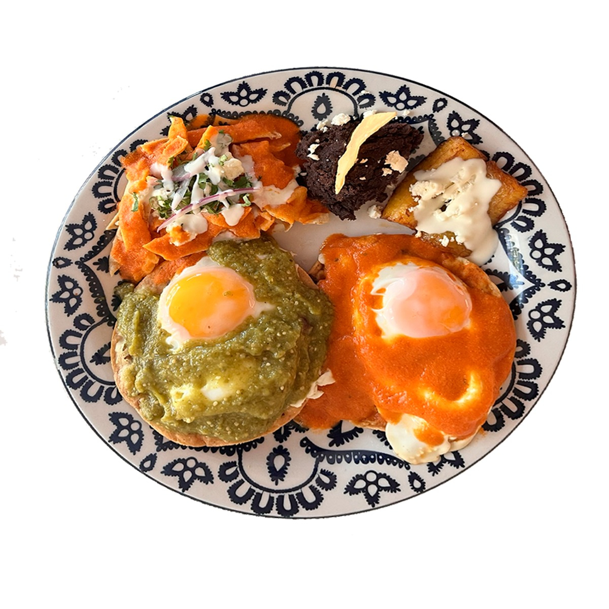 Huevos divorciados 2pz., acompañados de frijoles, chilaquiles y plátanos fritos.