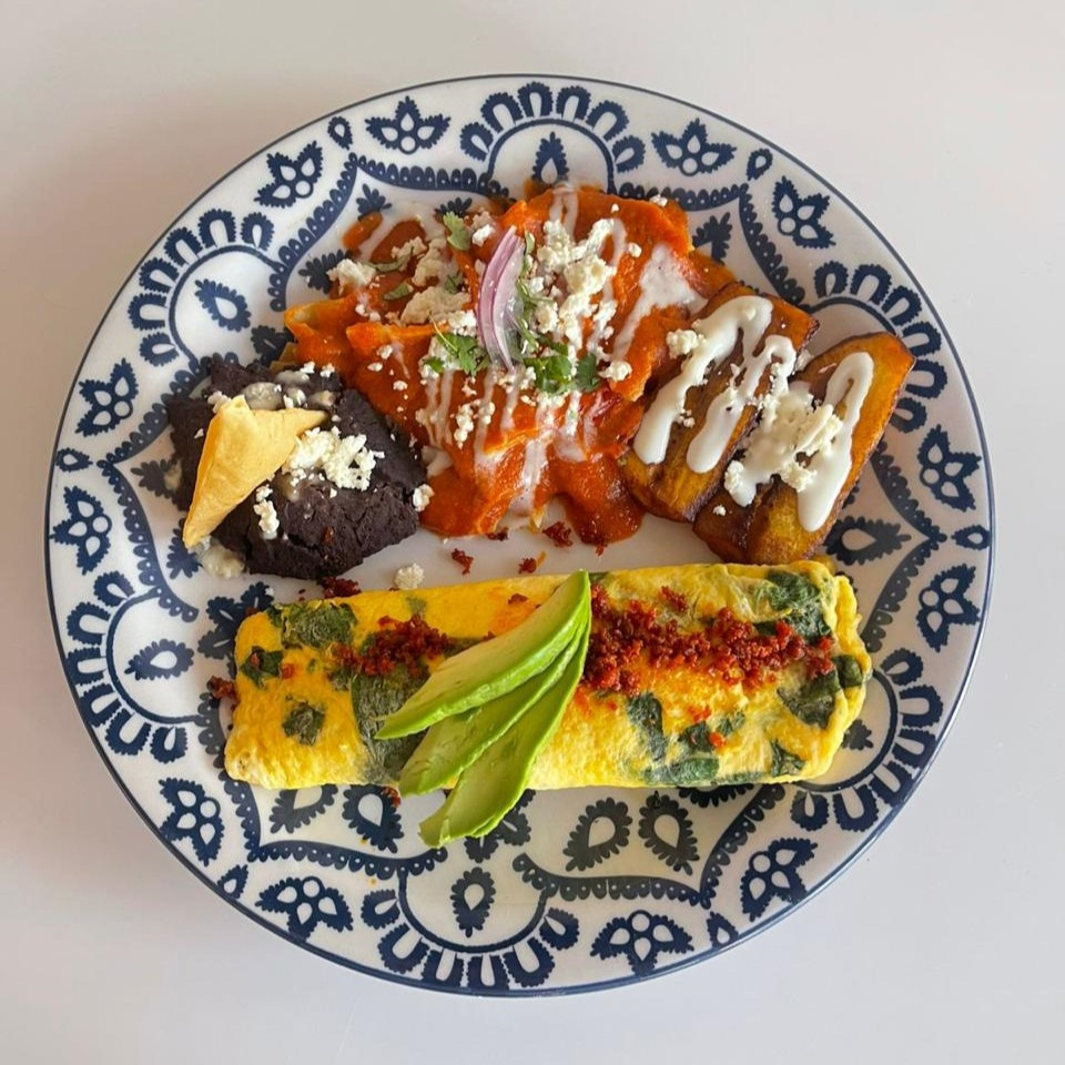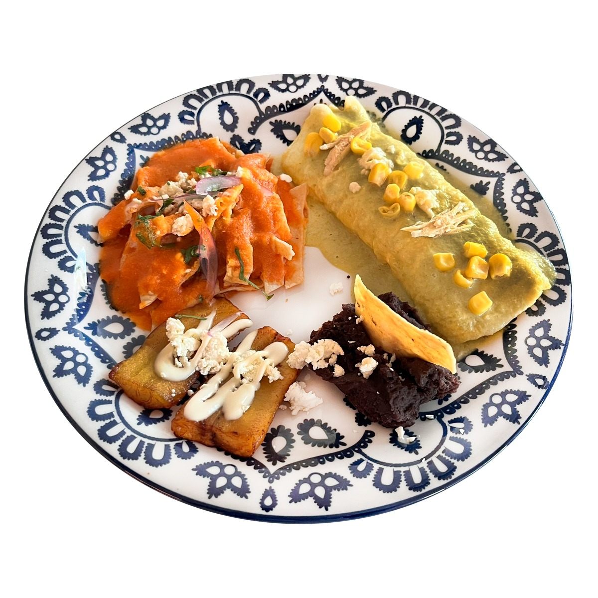 Relleno de pollo 120gr., elote, crema y queso Chiapas bañado en crema poblana, acompañado de frijoles, chilaquiles y plátanos fritos.