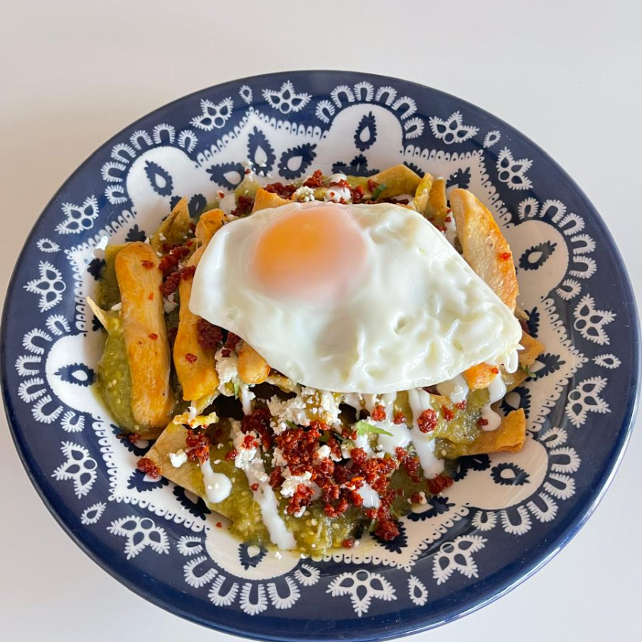 Deliciosos chilaquiles en salsa verde con tiras de pechuga asada 120gr., chorizo 60gr., y 1 huevo estrellado