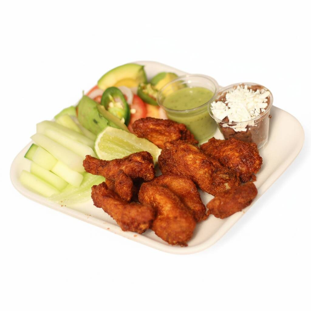 Crujientes alitas de pollo fritas (400 gr.) al punto ideal, doradas por fuera y jugosas por dentro. Se acompañan con ensalada fresca y frijoles refritos, creando un balance perfecto entre sabor y frescura.