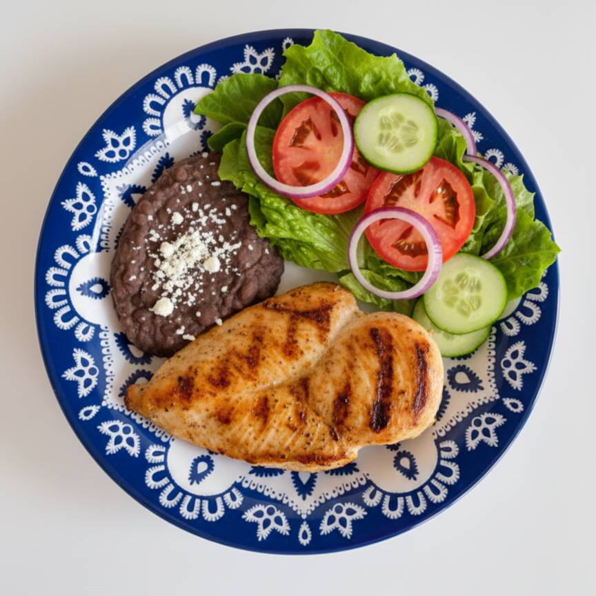 Jugosa pechuga de pollo preparada al punto perfecto, acompañada de ensalada fresca y frijoles refritos que complementan su sabor.