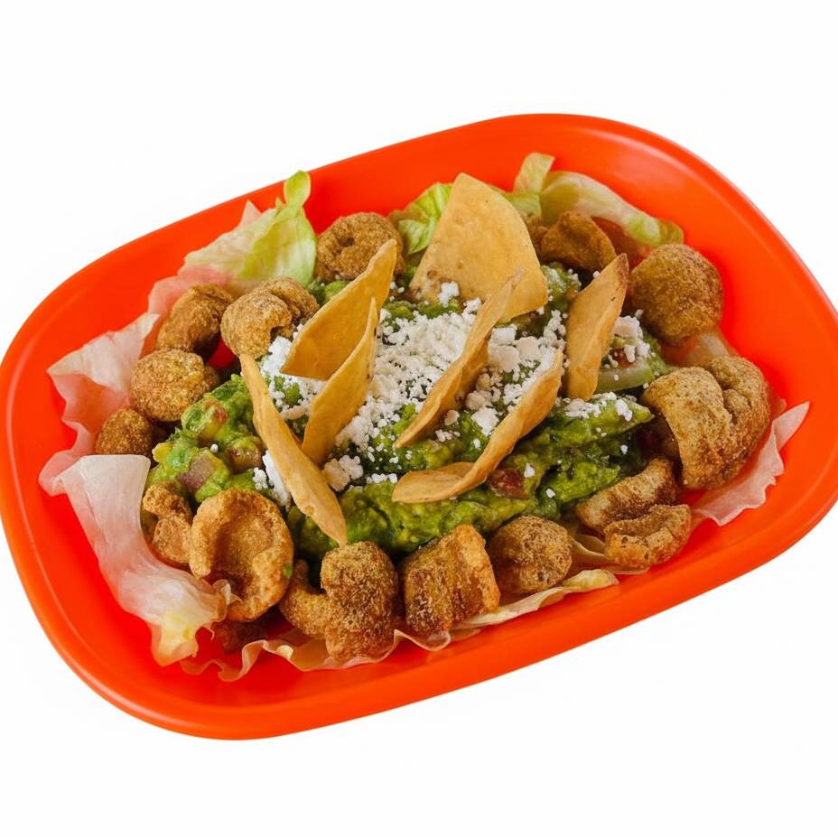 Una deliciosa combinación de aguacate fresco, machacado al punto perfecto y sazonado con limón natural, sal y un toque de cebolla y cilantro. Acompañado de crujientes trozos de chicharrón dorado, que aportan un contraste irresistible de textura y sabor. Ideal para compartir, botanear o disfrutar como antojo tradicional lleno de sabor mexicano.