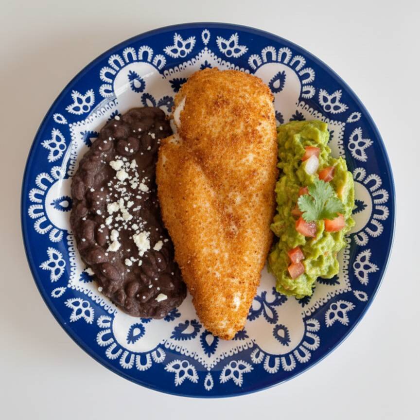 Crujiente pechuga de pollo empanizada, dorada al punto perfecto y jugosa por dentro. Se acompaña con guacamole fresco y frijoles refritos, creando una combinación deliciosa de texturas y sabores tradicionales.