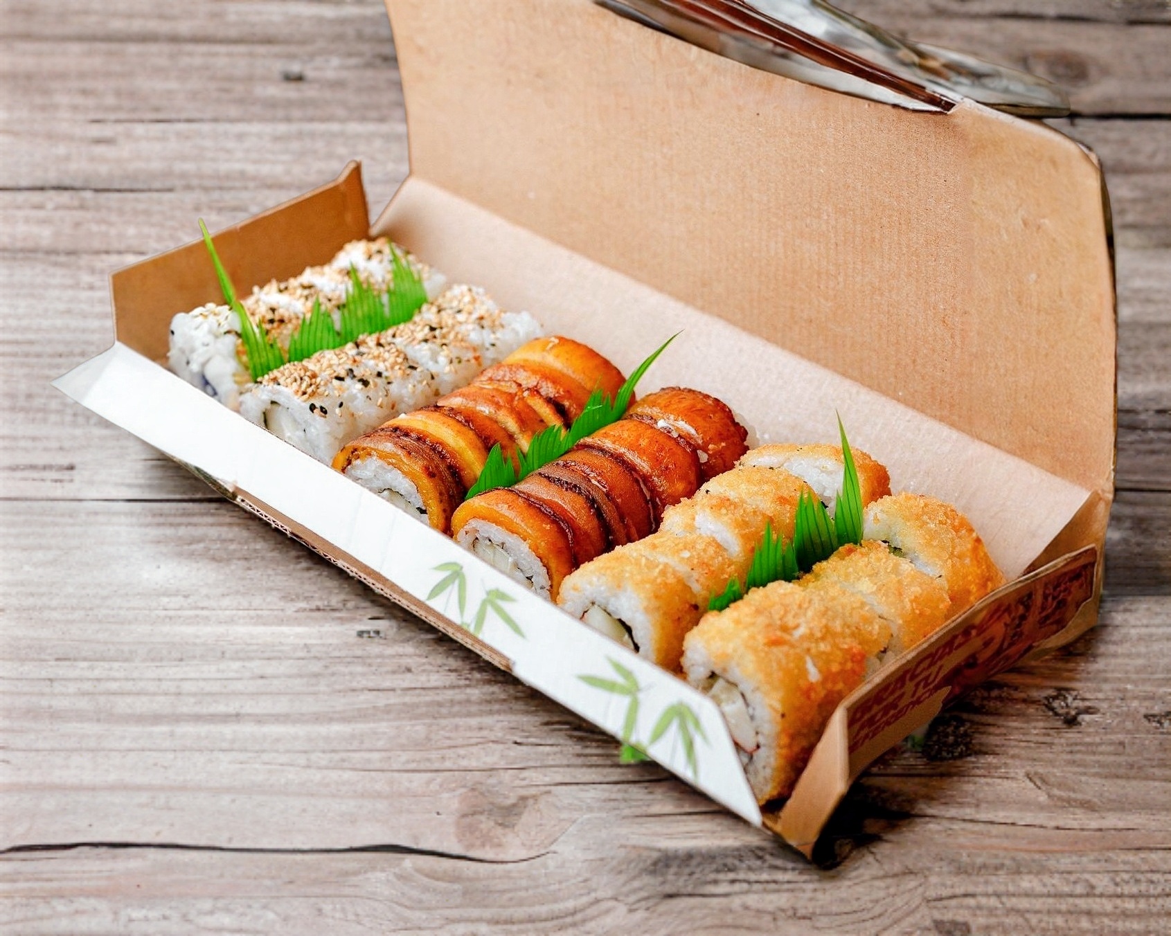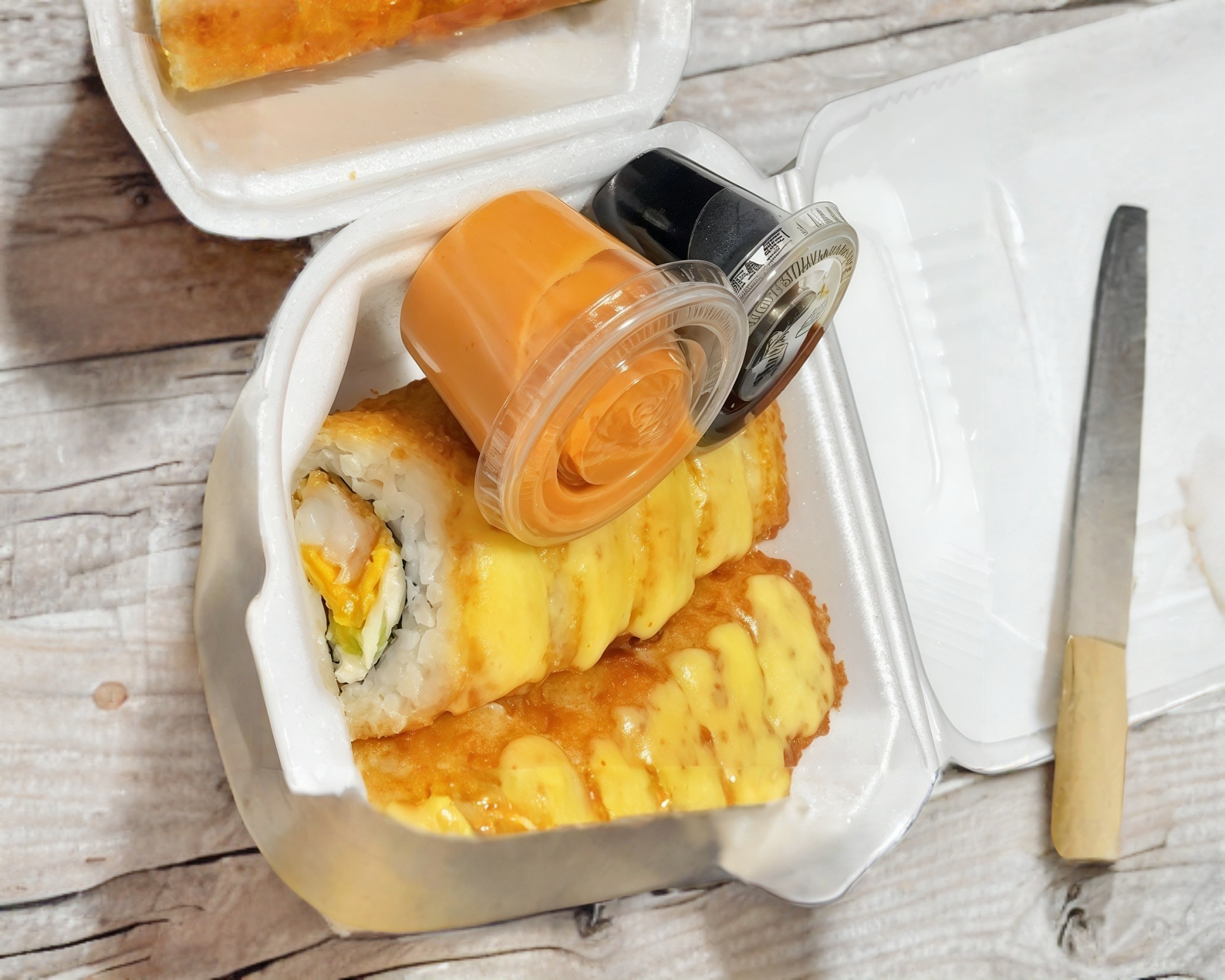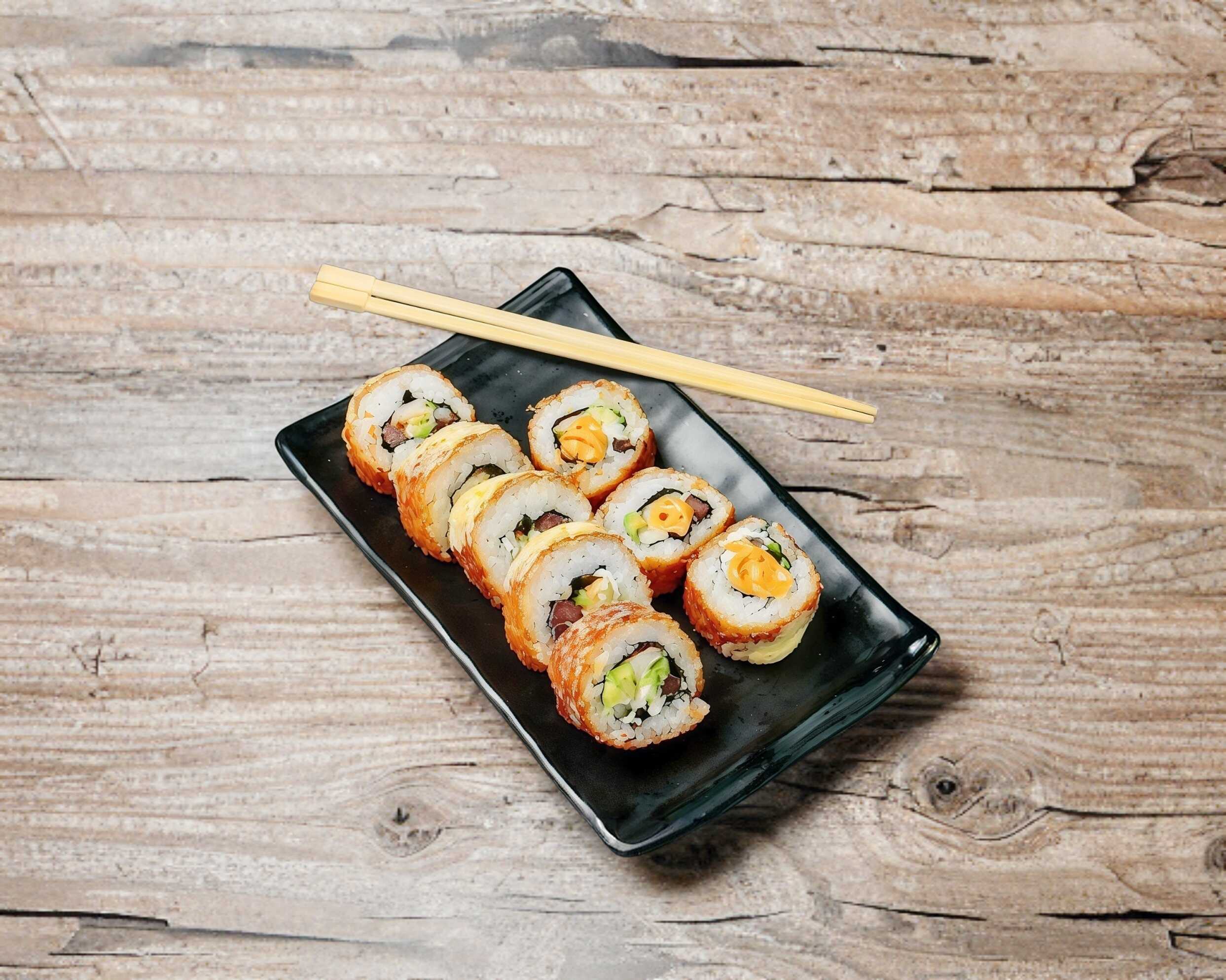 3 rollos mixtos (25-30 bocados aproximadamente.) todos rellenos de , surimi y pepino. Incluye 1 cubierto de plátano, 1 empanizado y 1 cubierto de ajonjolí. Incluye 1 soja, 1 par de palillos y 1 aderezo chipotle. (Para máx. 3 personas)