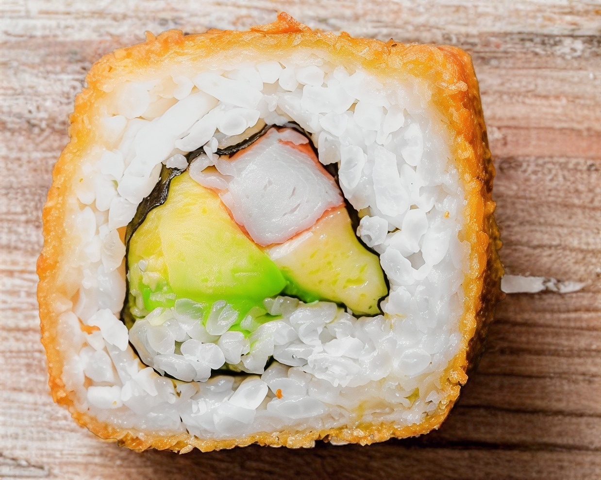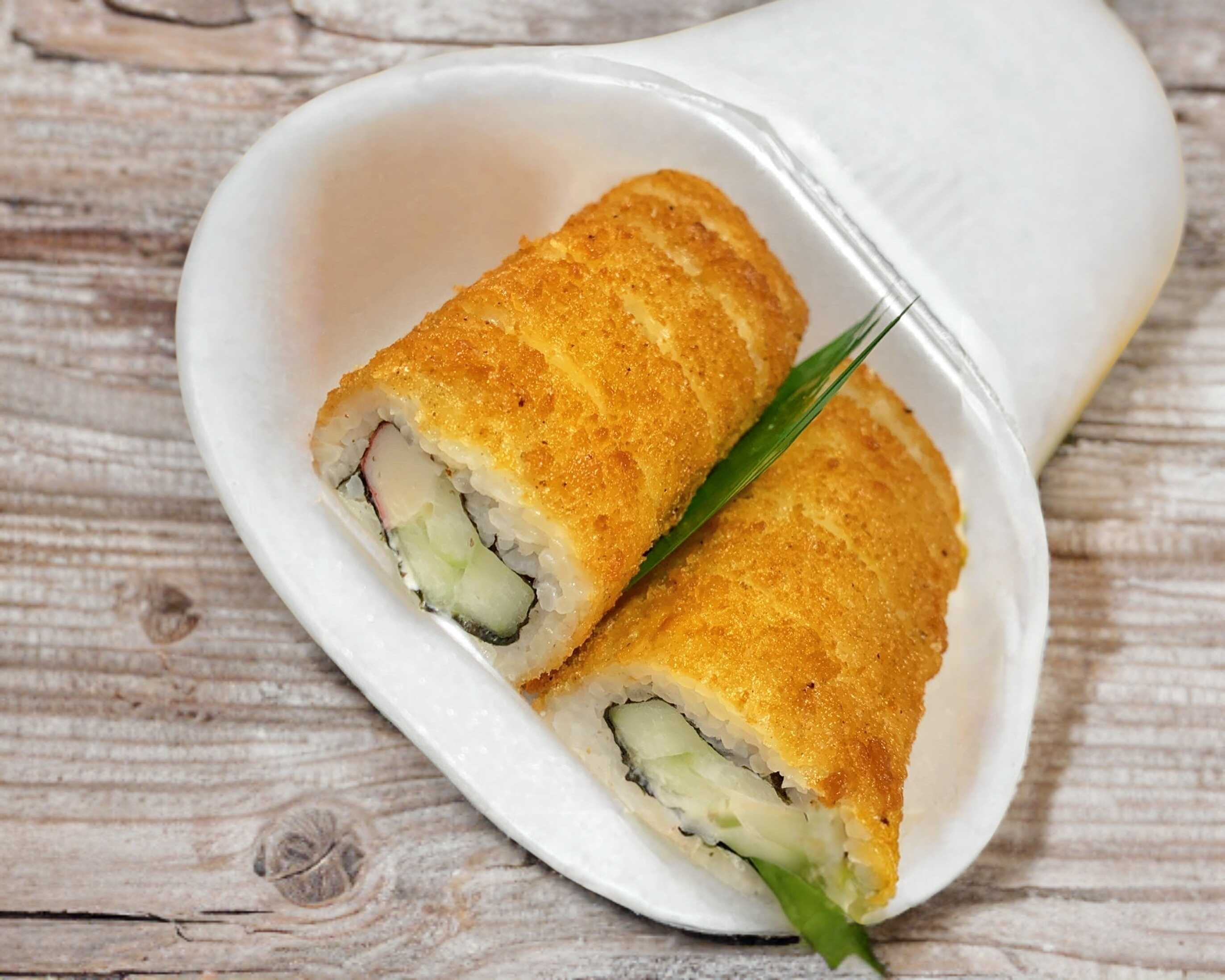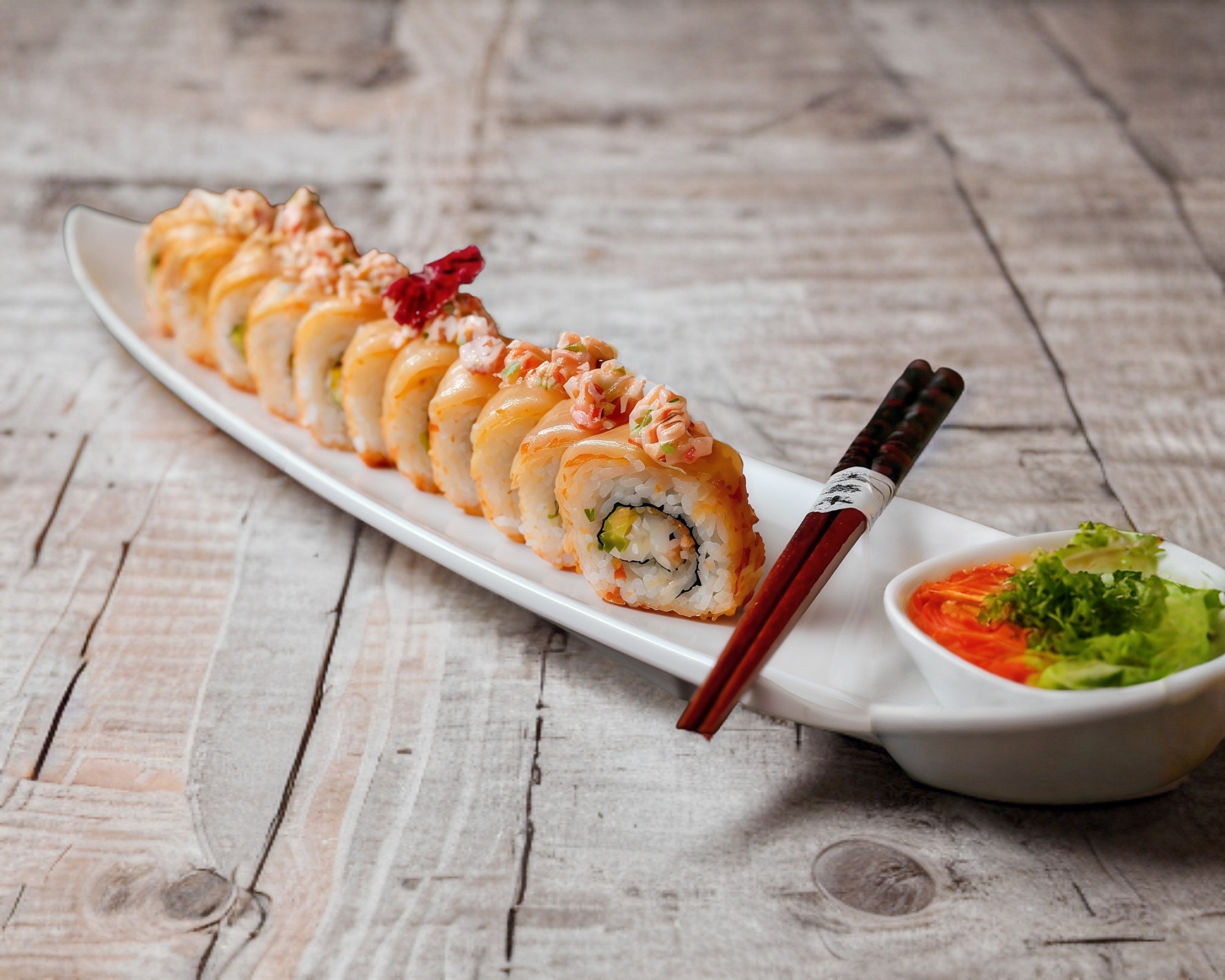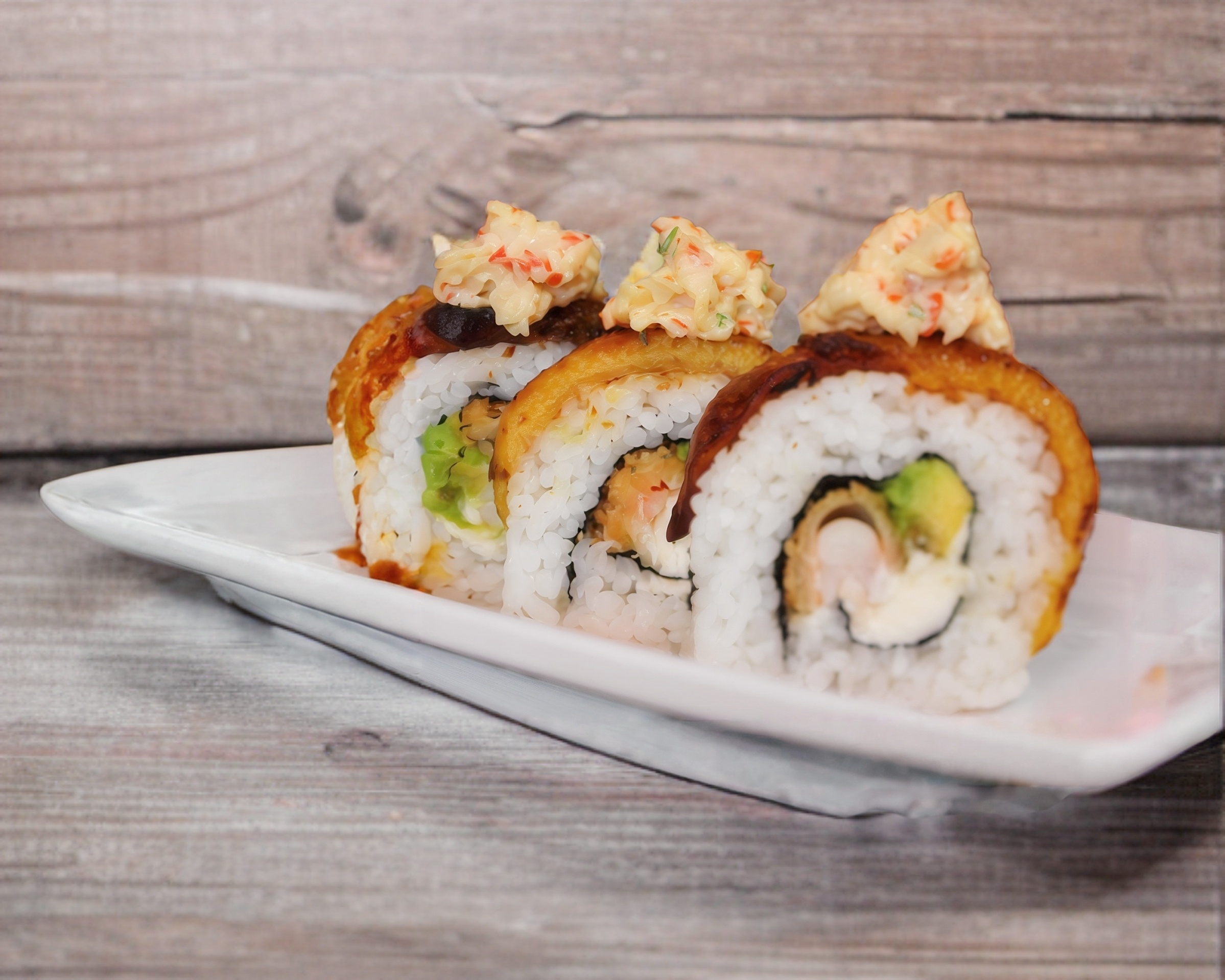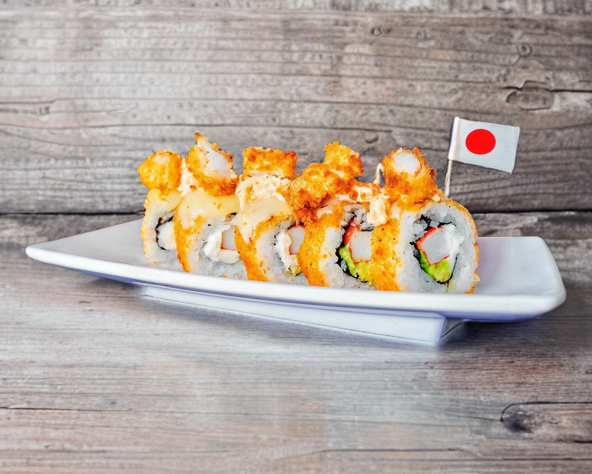 Por dentro: queso crema, pepino, aguacate, camarón, surimi, por fuera: cubierto de crujiente empanizado, queso manchego gratinado y salsa chipotle.