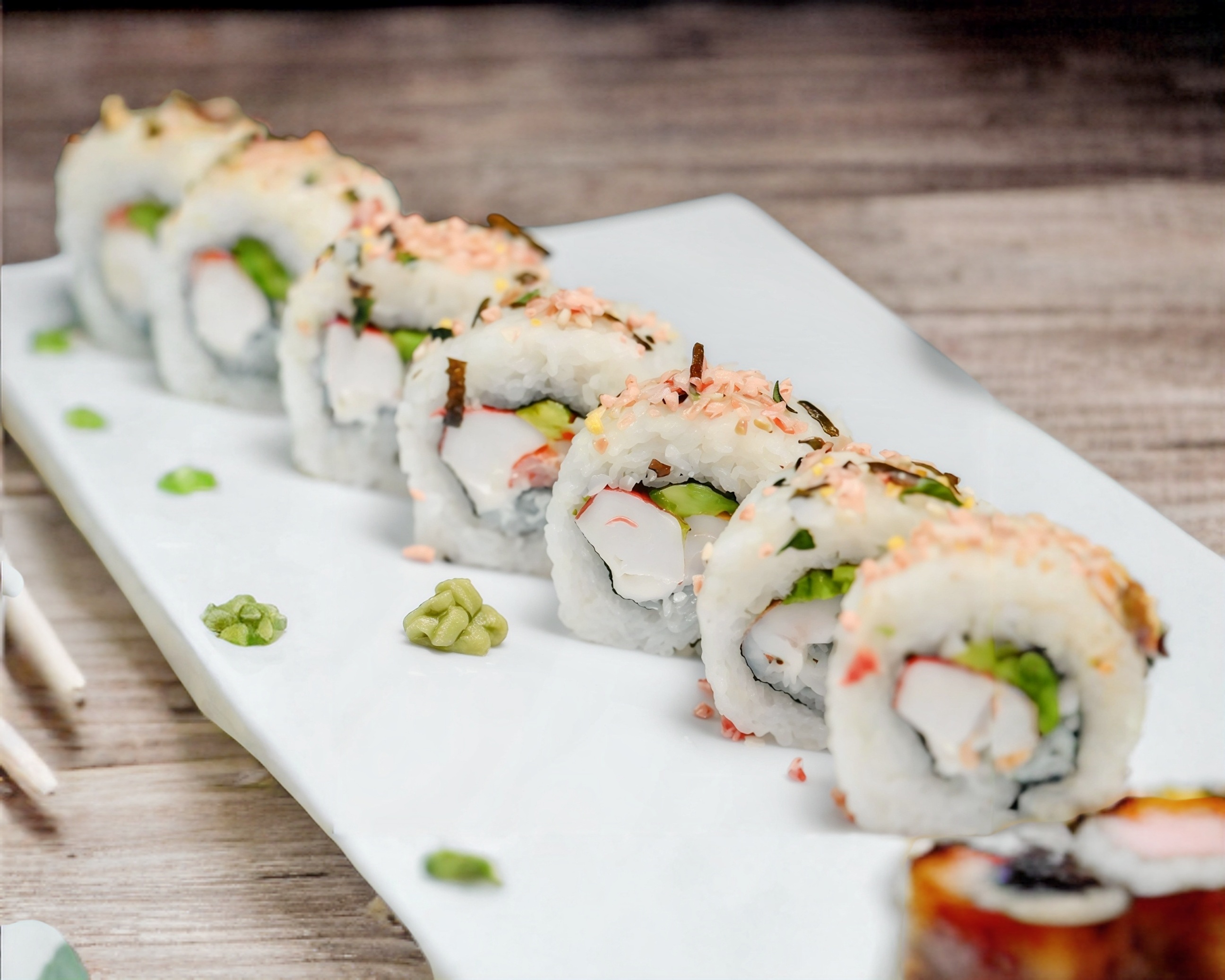 Por dentro: queso crema, aguacate, camarón, surimi y pepino, por fuera cubierto de furikake (condimento japones).