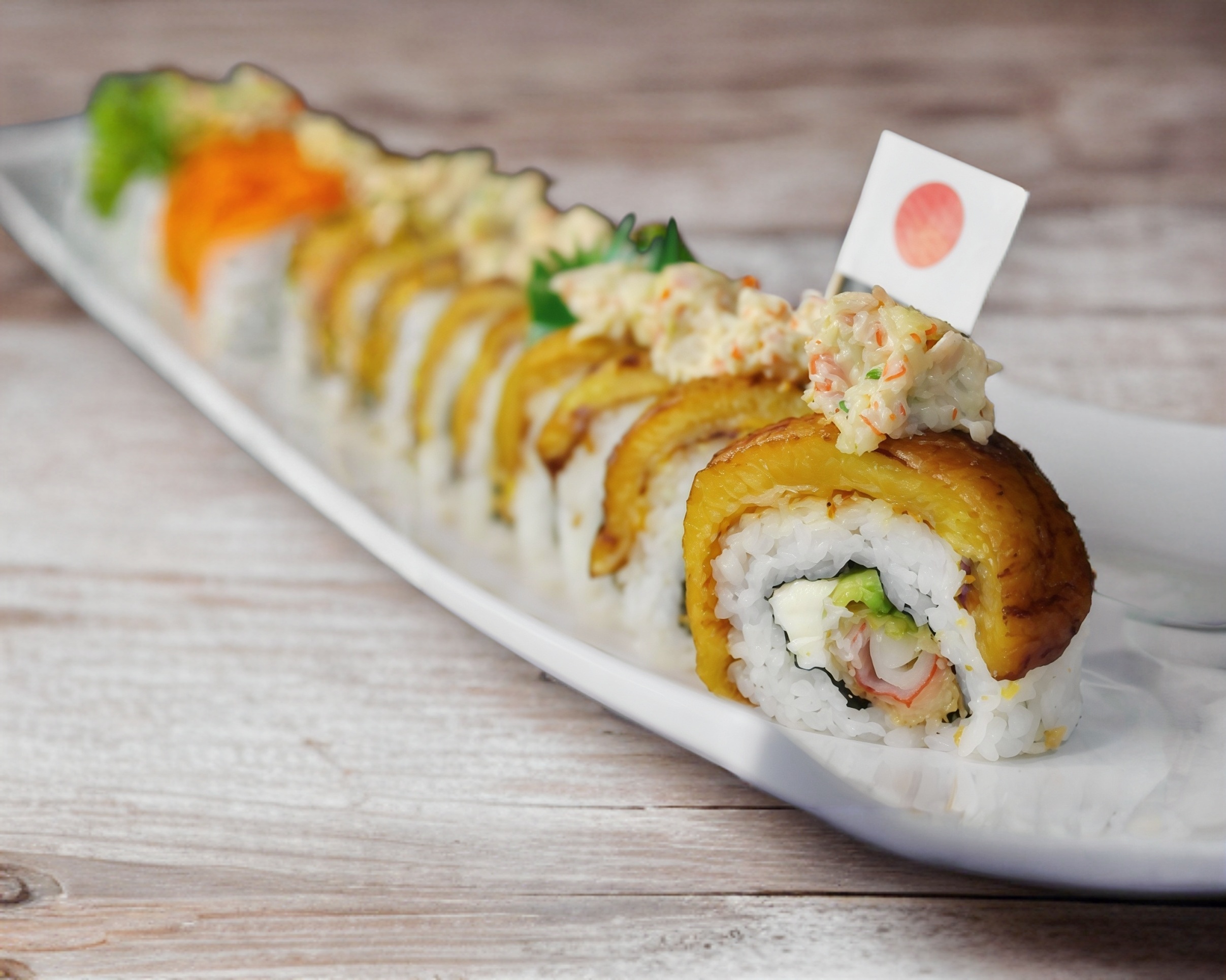 Por dentro: queso crema, pepino, aguacate, por fuera: cubierto de plátano frito y salsa de anguila.