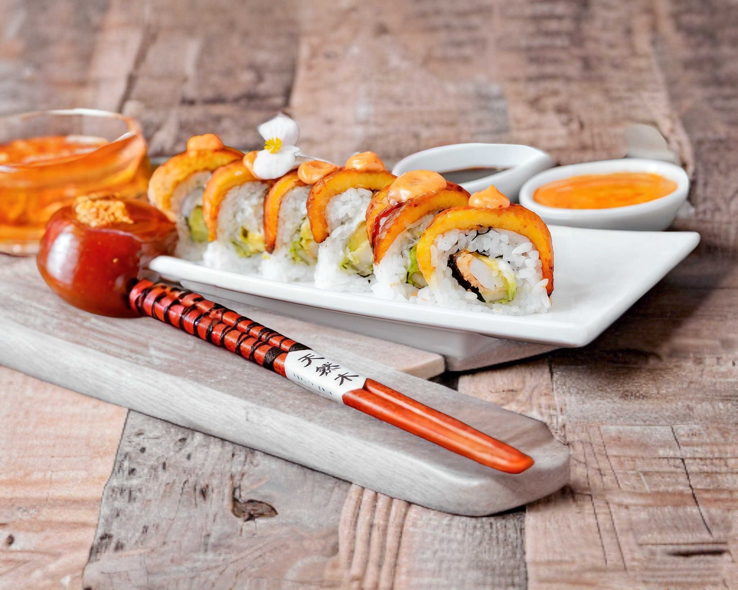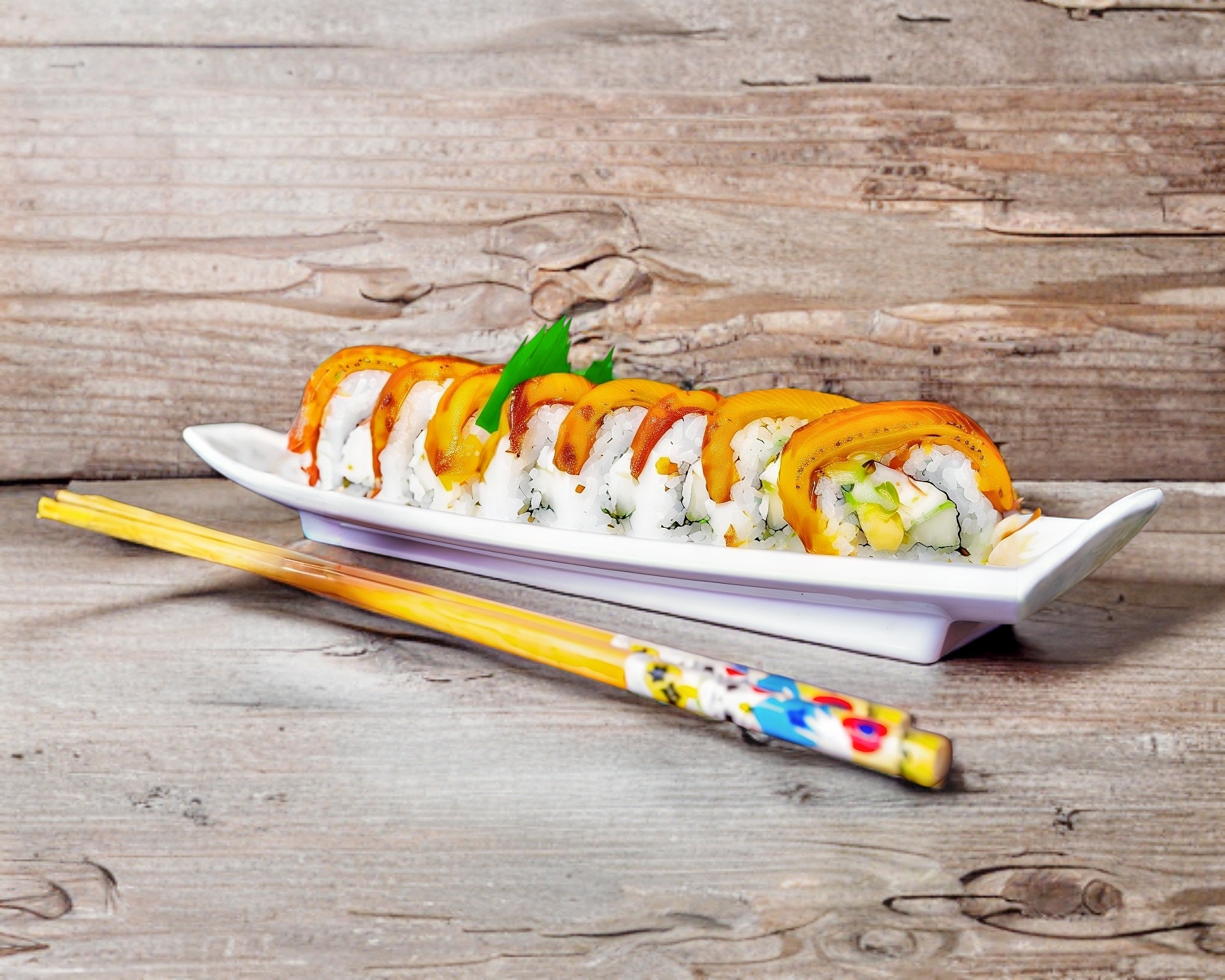 Por dentro: queso crema, zanahoria, aguacate, camarón, queso manchego, por fuera: cubierto de crujiente empanizado y salsa de anguila.