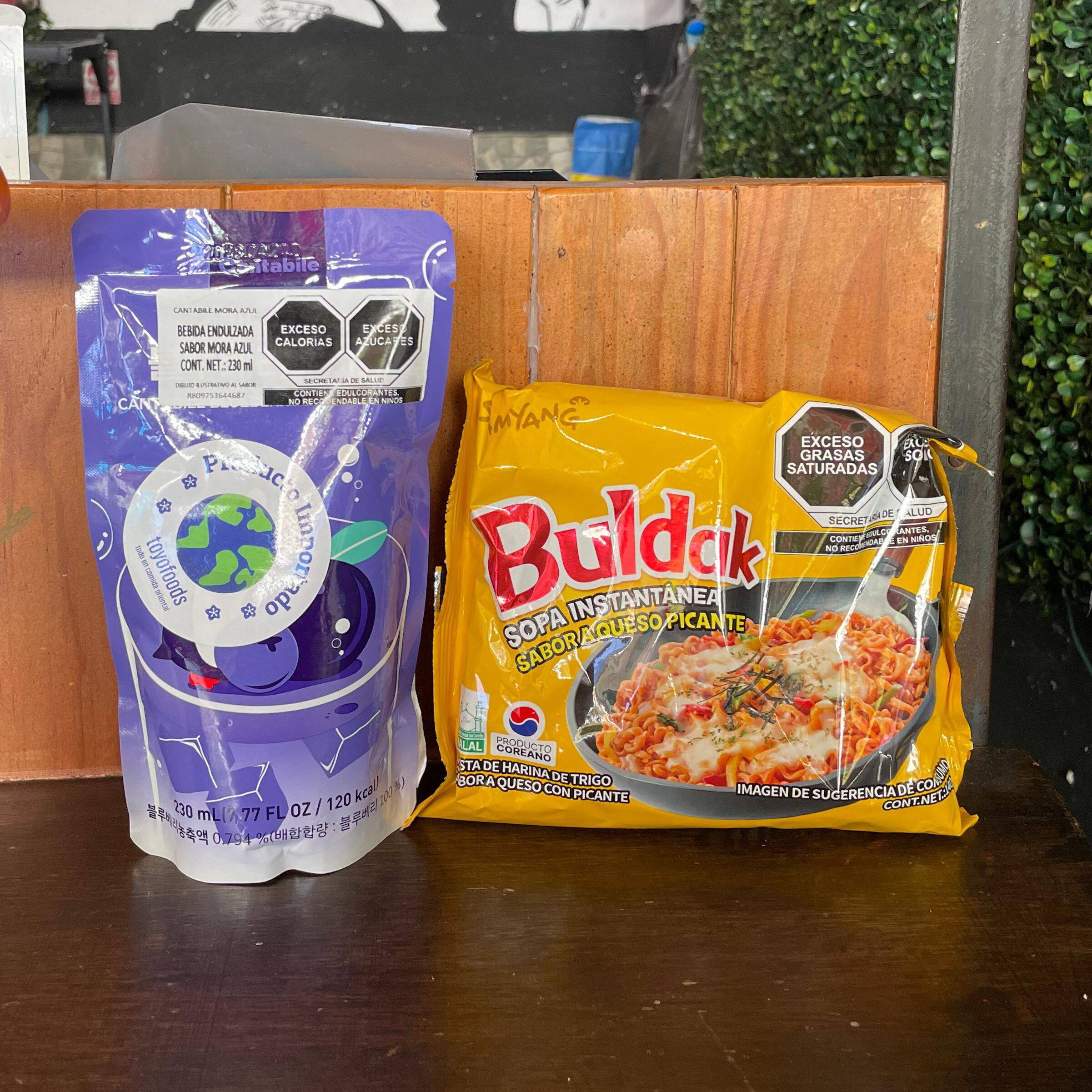 Ramen instantáneo sabor queso picante (sin preparar) y 1 bebida oriental a disponibilidad del restaurante (puede variar marca y sabor)
