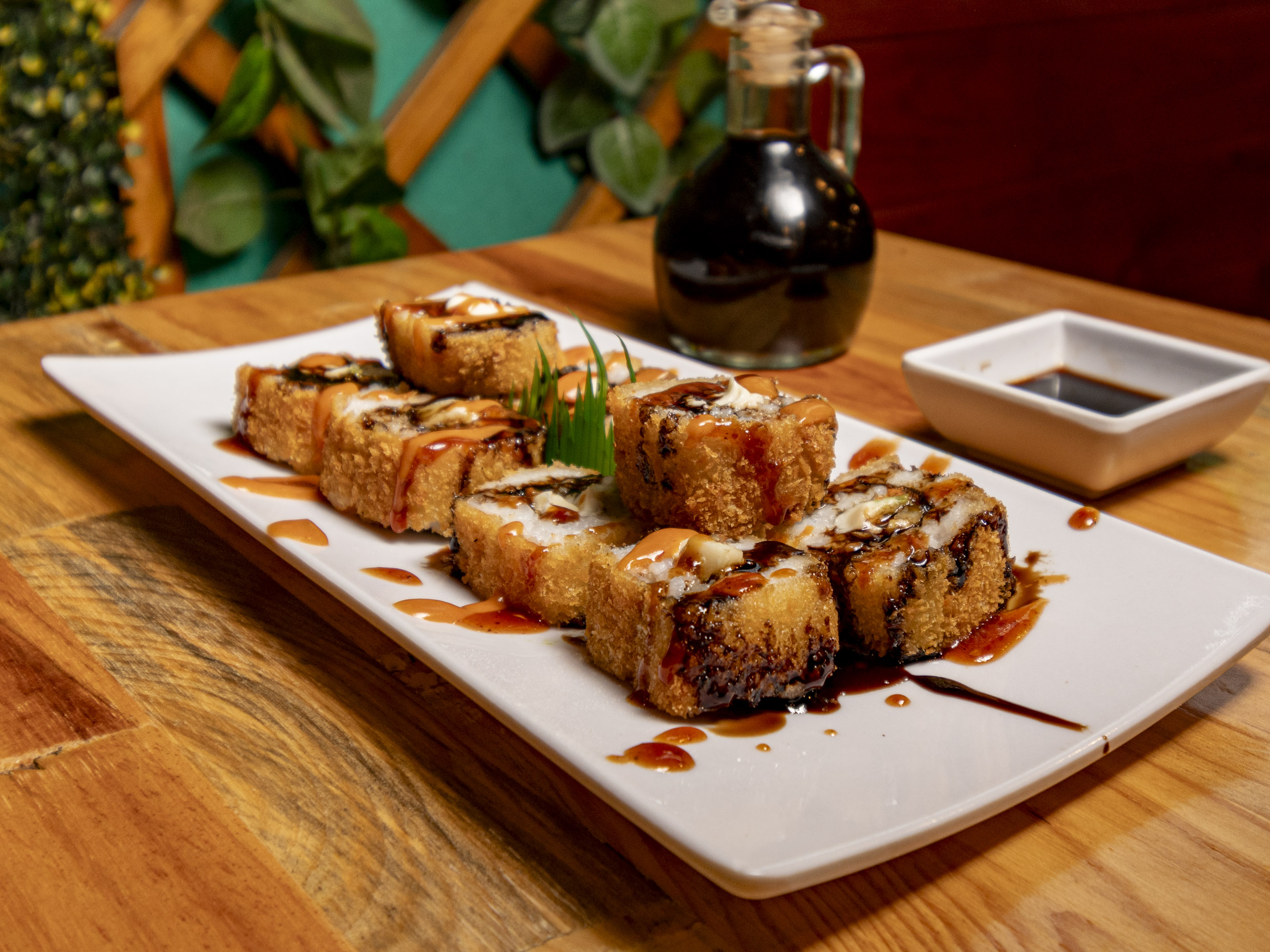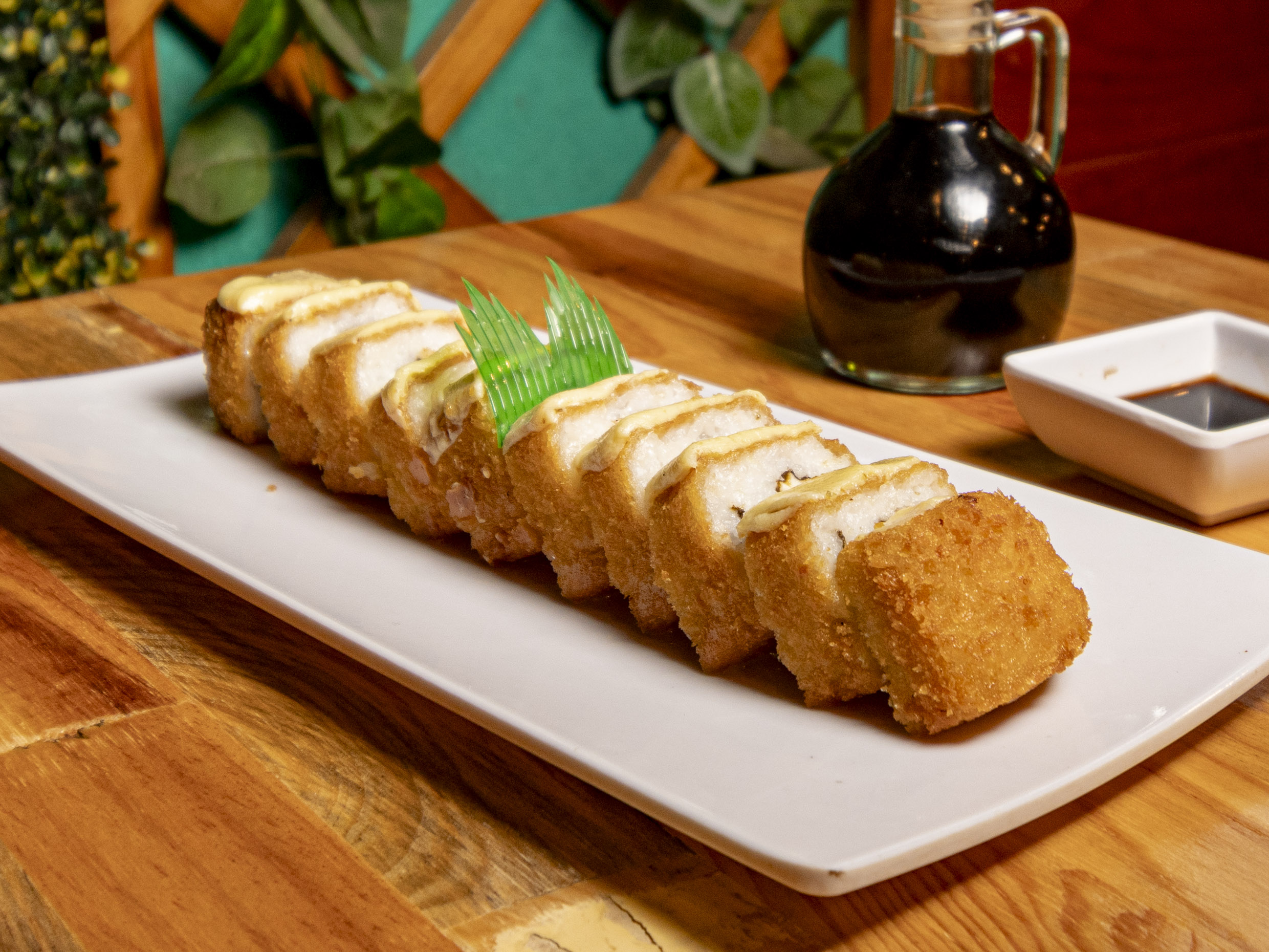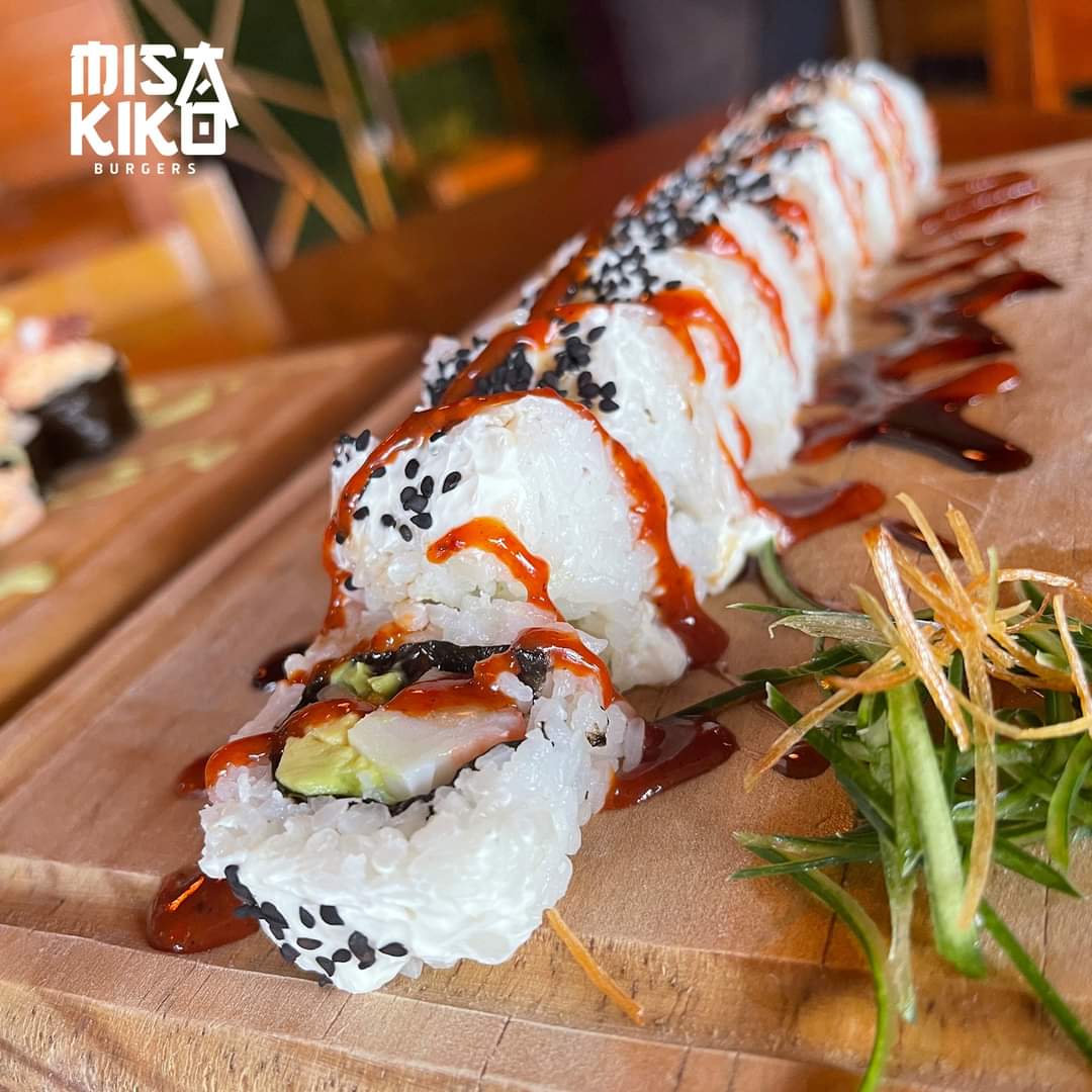 Relleno de pepino, aguacate, queso Philadelphia, surimi, cubierto de plátano frito y acompañado de salsa de anguila.