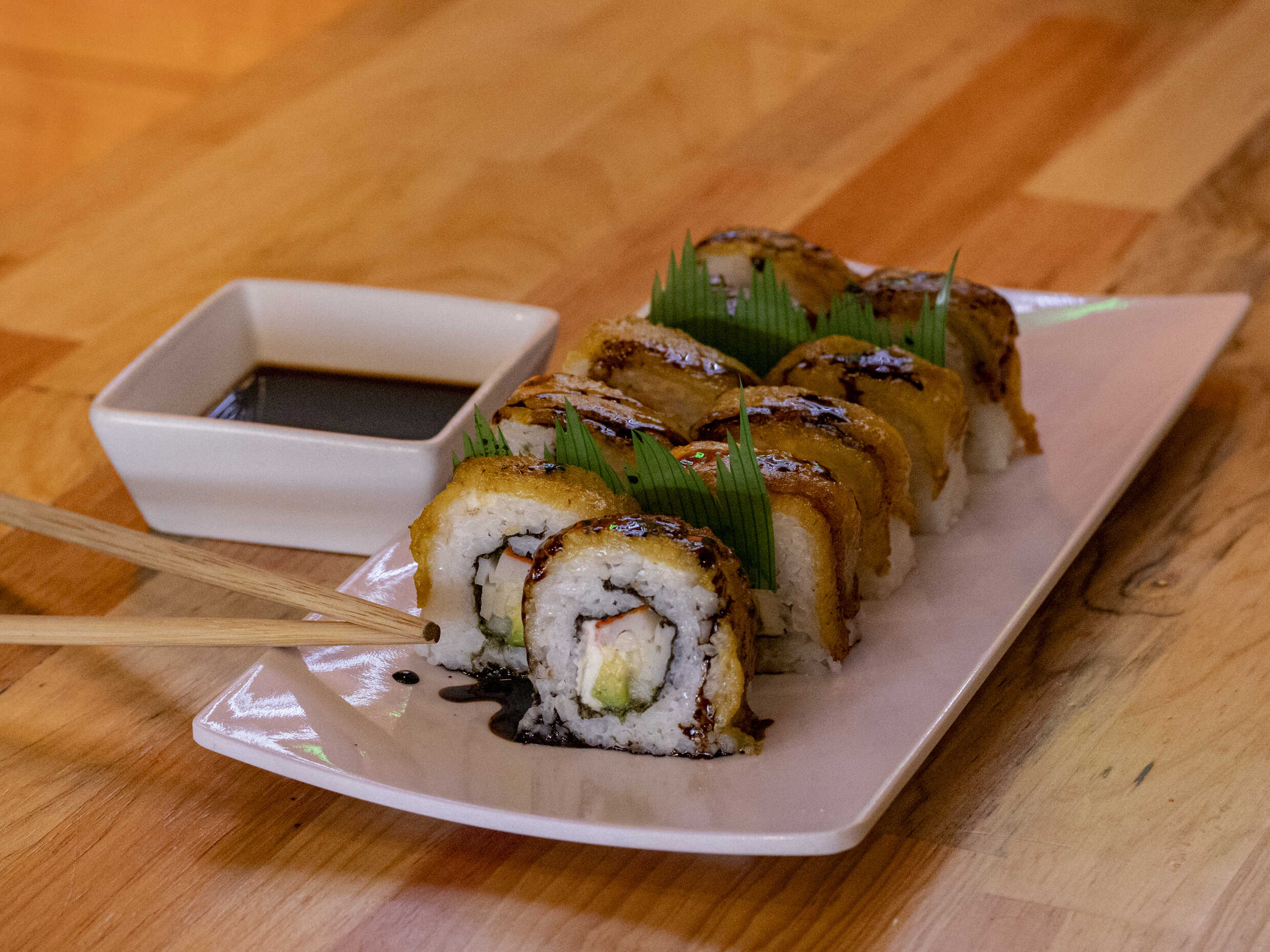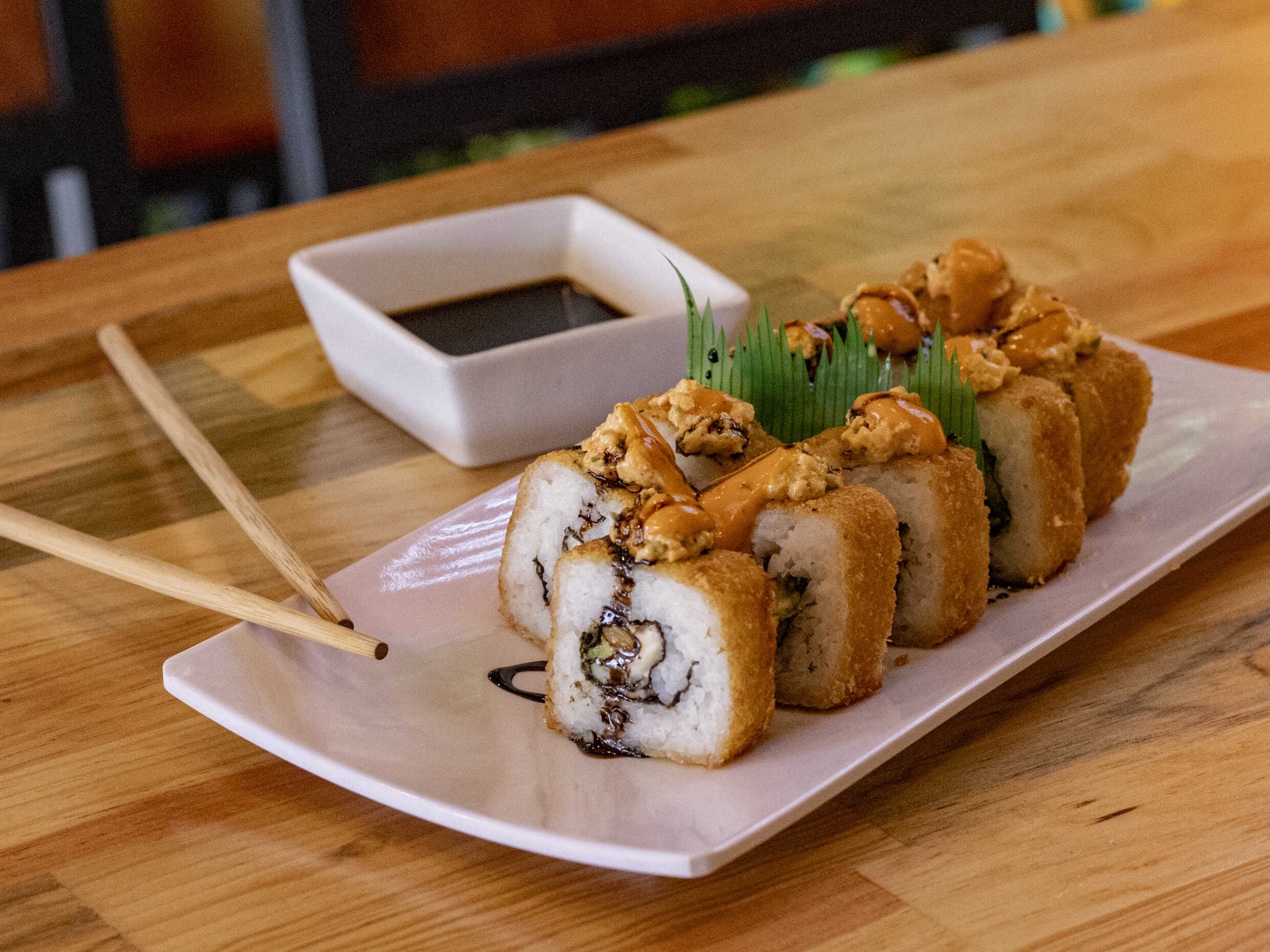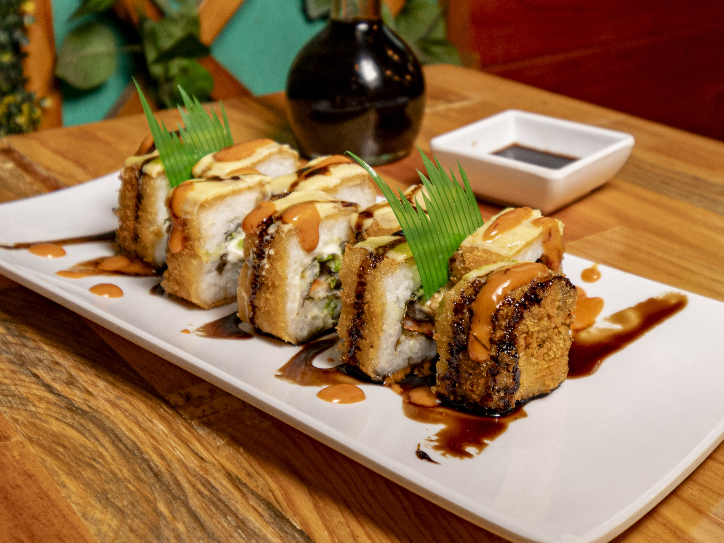 Relleno de pepino, aguacate, queso Philadelphia, surimi, cubierto de plátano frito y acompañado de salsa de anguila.