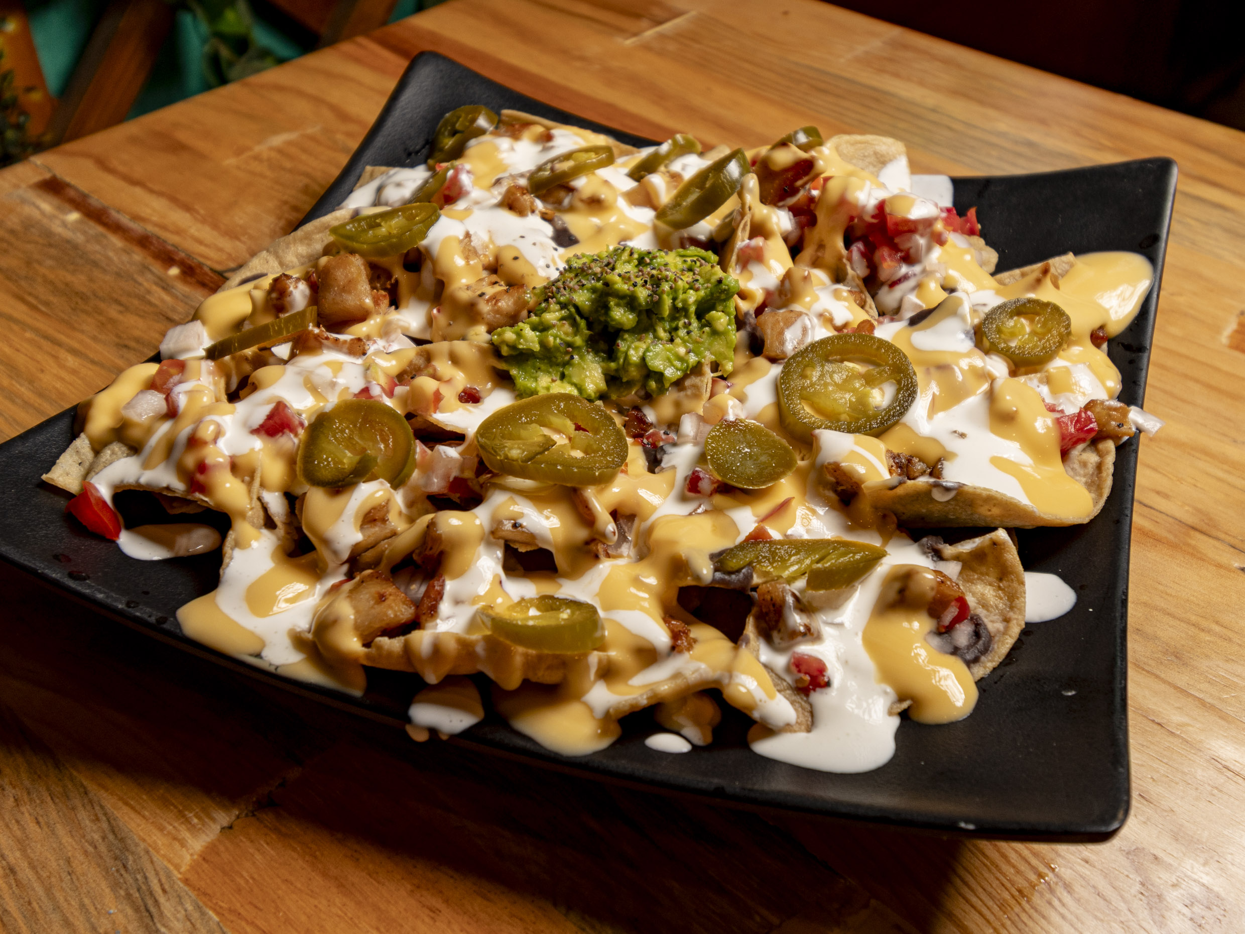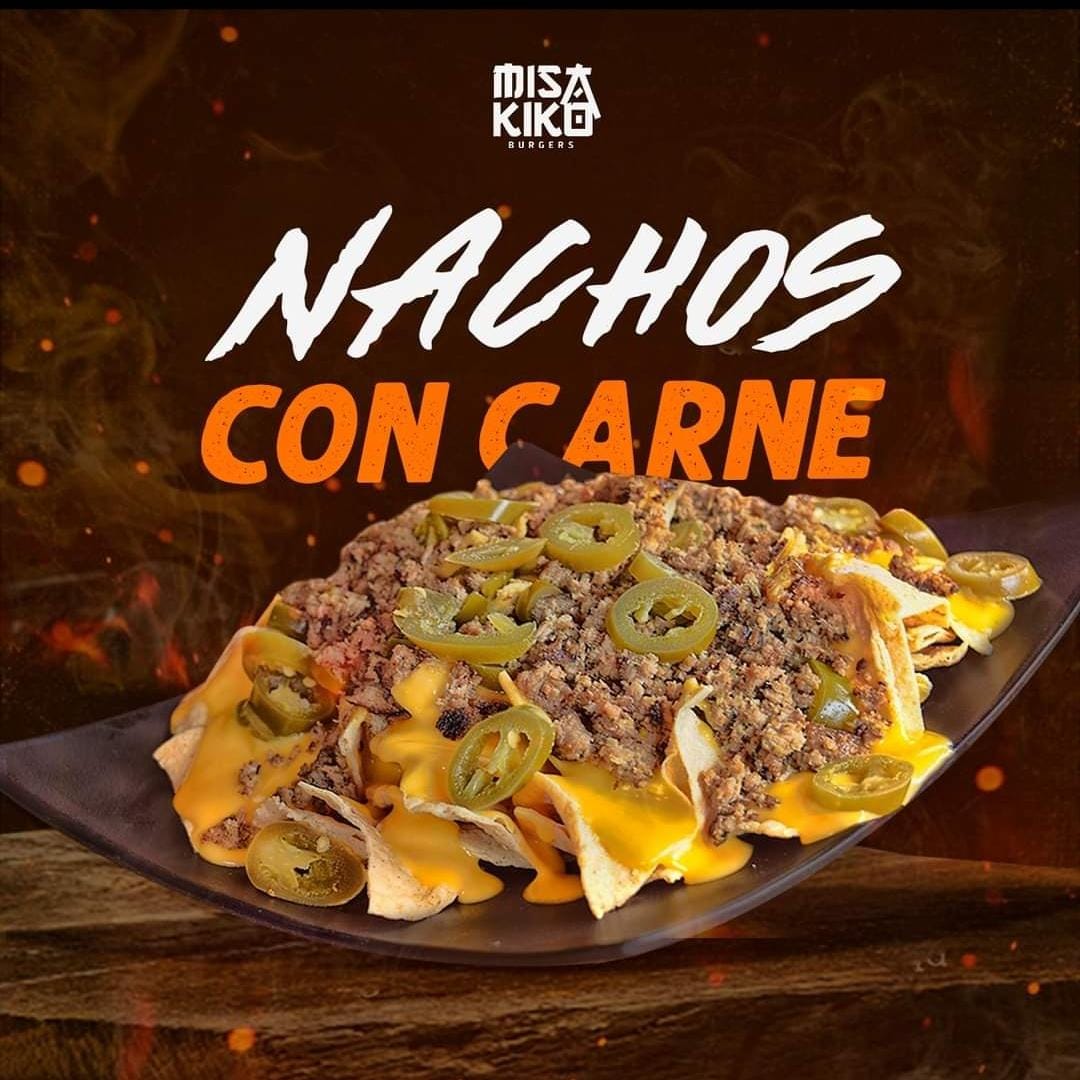 Con carne de arrachera molida, frijol, queso para nachos, crema, pico de gallo y guacamole.