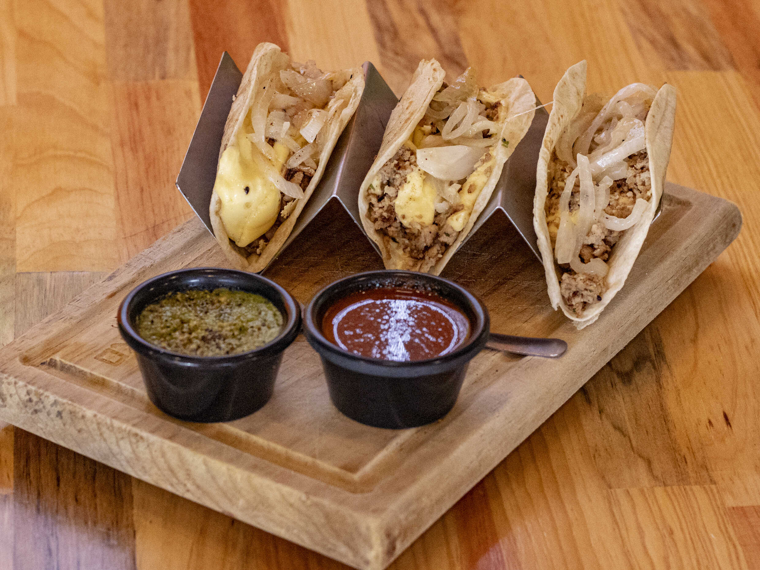 3 Tacos con tortilla de harina, costra de queso, nuestra carne de hamburguesa, guacamole y salsa brava.