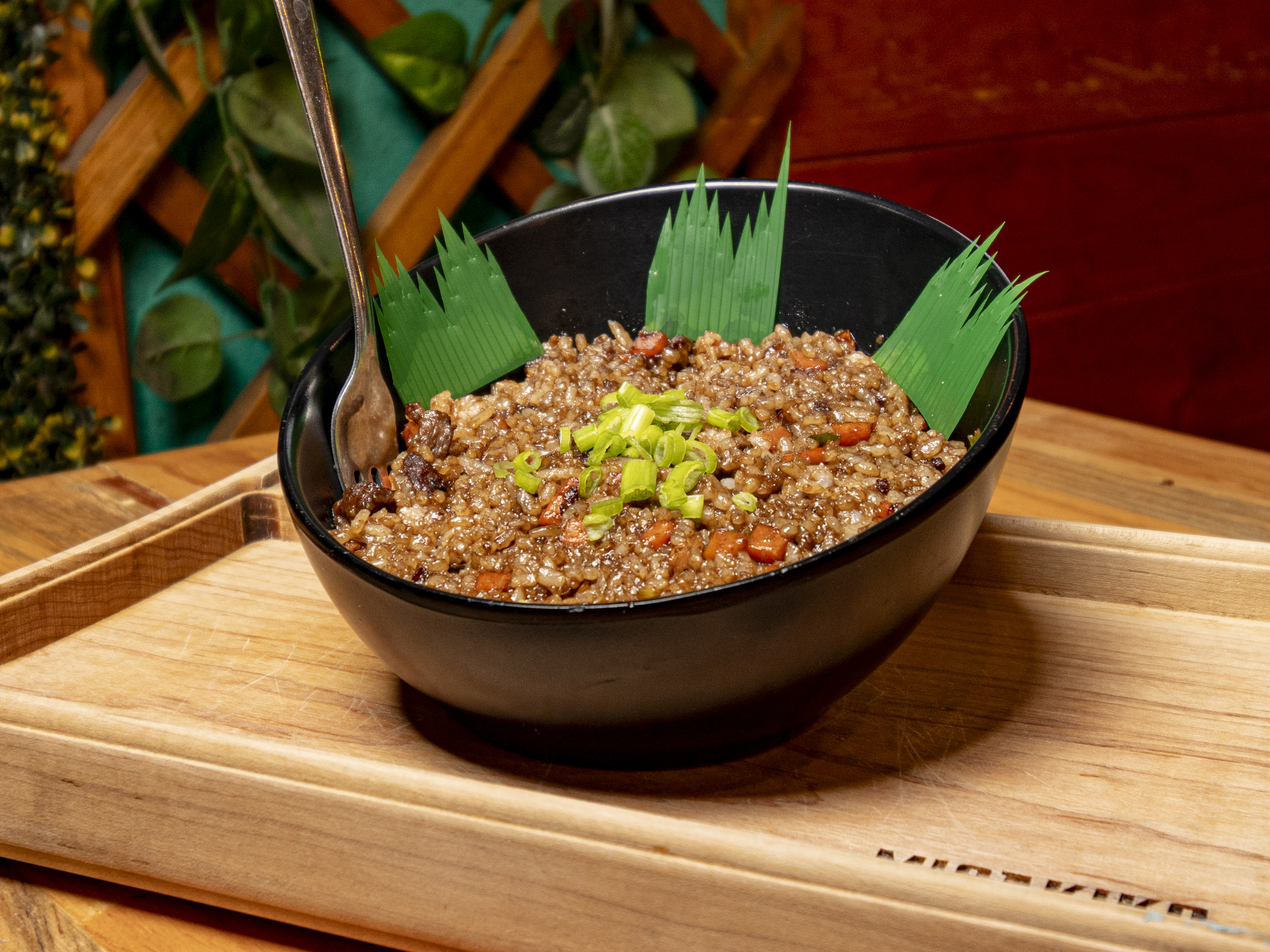 Arroz frito, acompañado de pollo, res, zanahoria y cebollín.