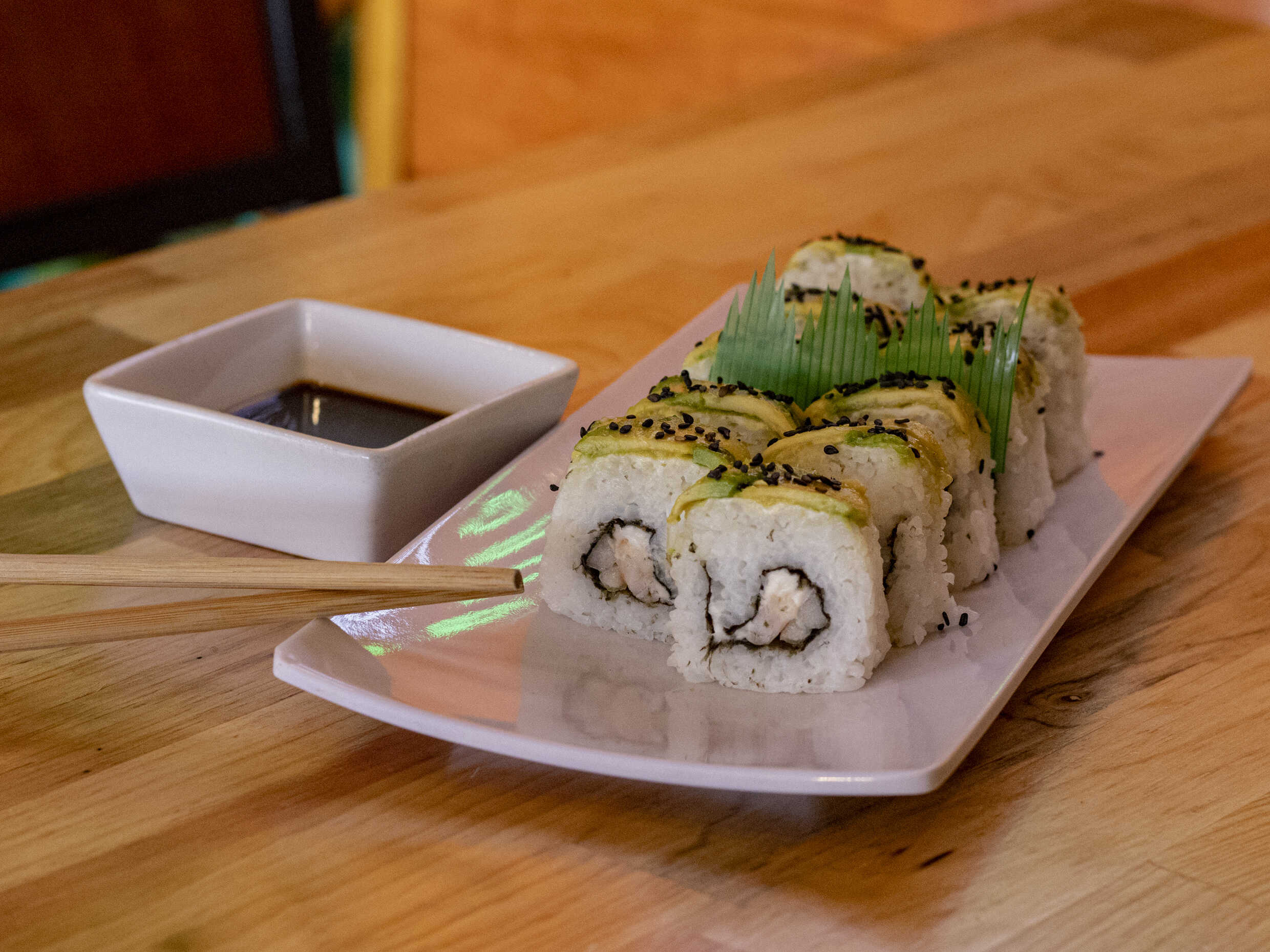 Relleno de pepino, aguacate, surimi, cubierto de queso Philadelphia, ajonjolí negro, aderezo spicy y acompañado de salsa de anguila.