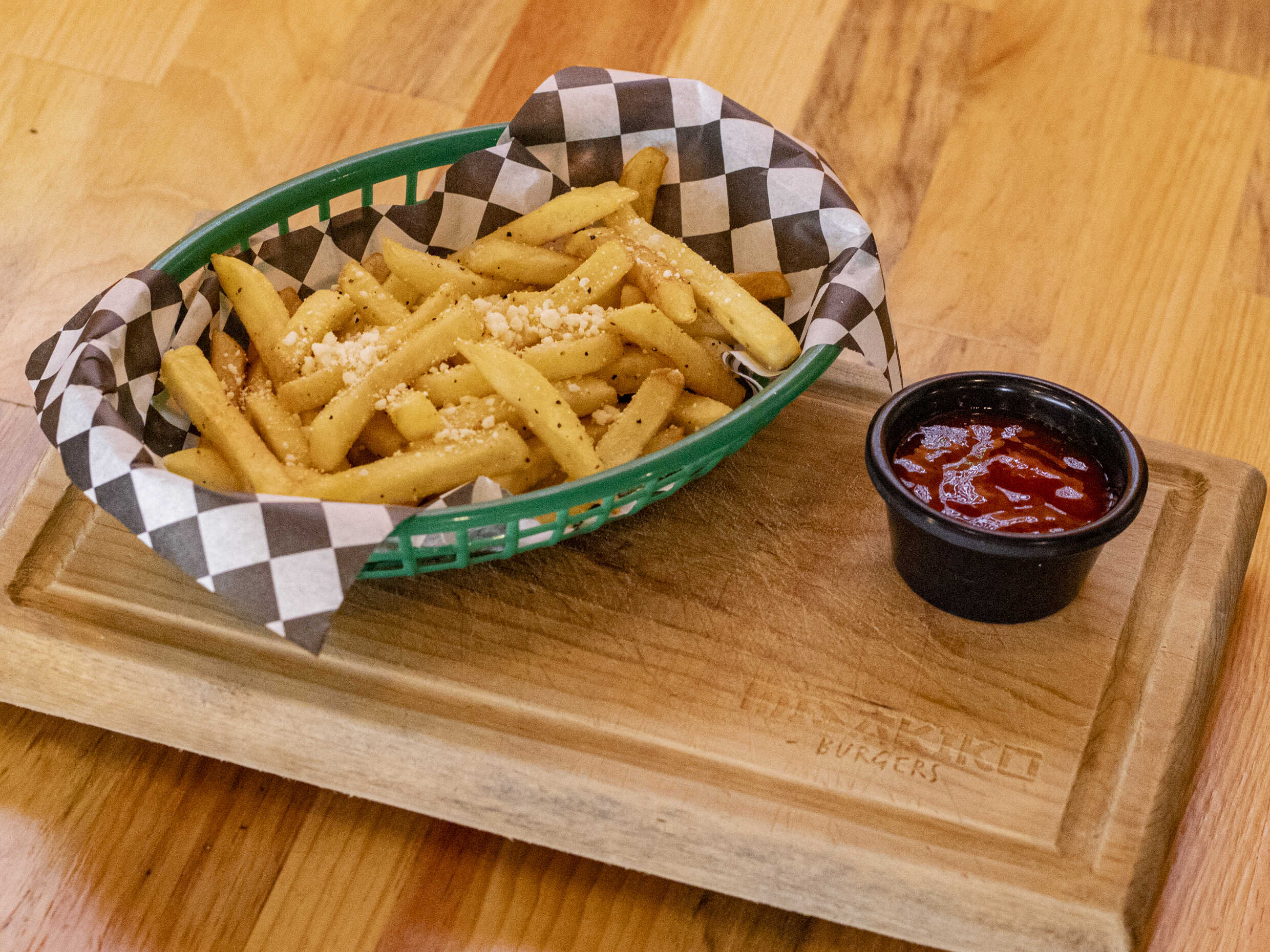 125 g de carne de res, pepperoni, queso panela asado, camarones flameados a la mantequilla, lechuga, tomate, tocino, queso parmesano y cebolla caramelizada.