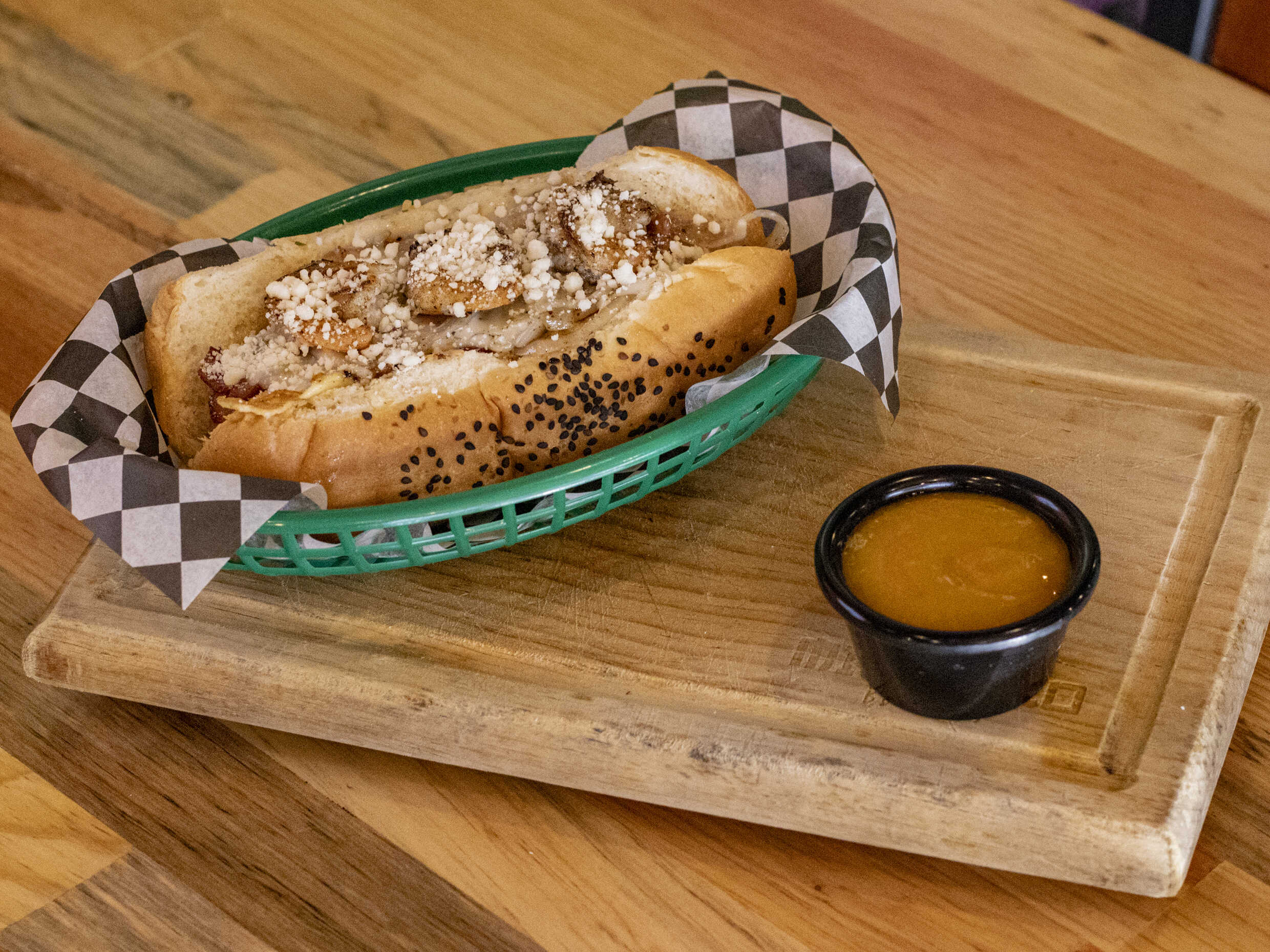 Hocho tradicional con nuestra salchicha de res gourmet, acompañado de 3 camarones a la mantequilla y parmesano.