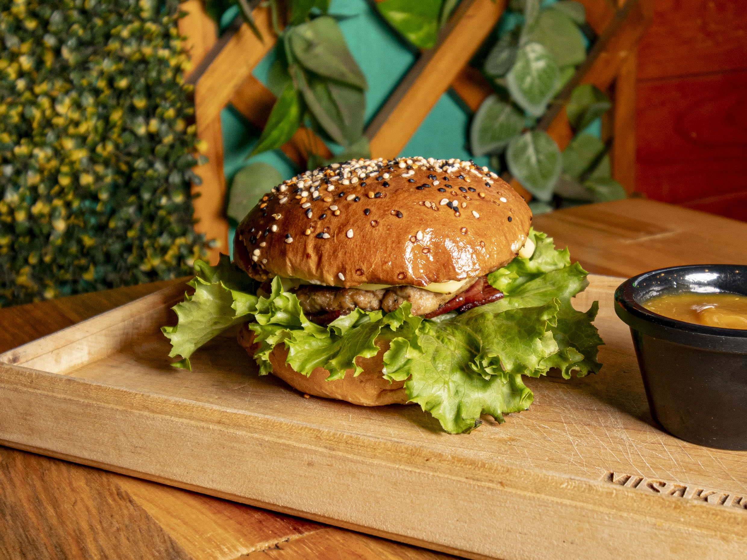 125 g de carne de res, manchego, cebolla caramelizada, lechuga, tomate y tocino.
