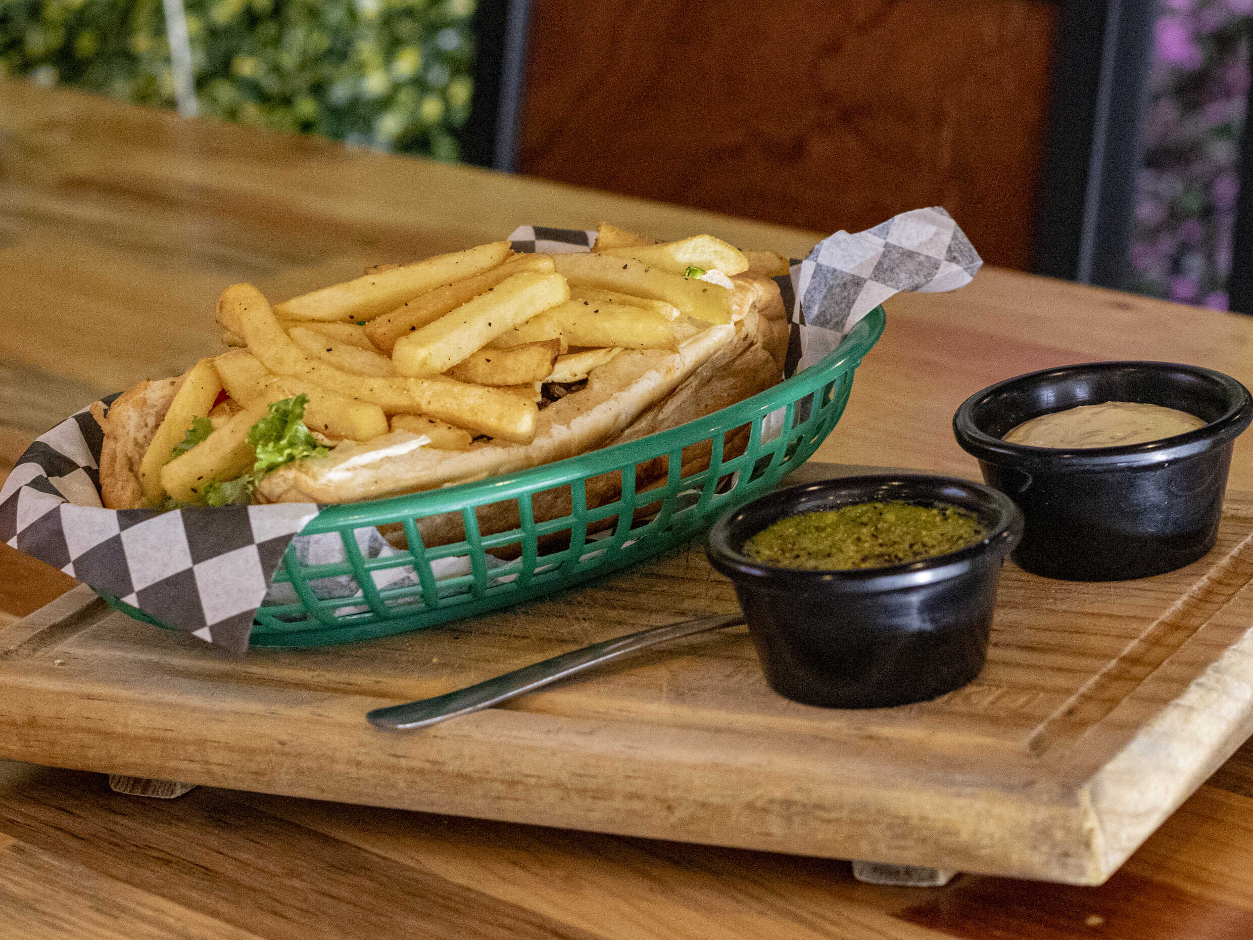 Delicioso baguette con 125 g de carne de arrachera con queso gratinado, guacamole, jitomate, lechuga hidropónica, aderezo tártara, acompañado de unas deliciosas papas a la francesa.