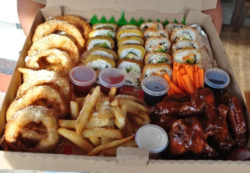 Incluye banana roll, empanizado roll, 10 alitas, aros de cebolla y papas a la francesa.