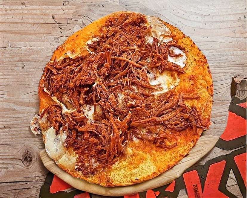 frijoles, queso, birria, pico de gallo, aguacate y crema