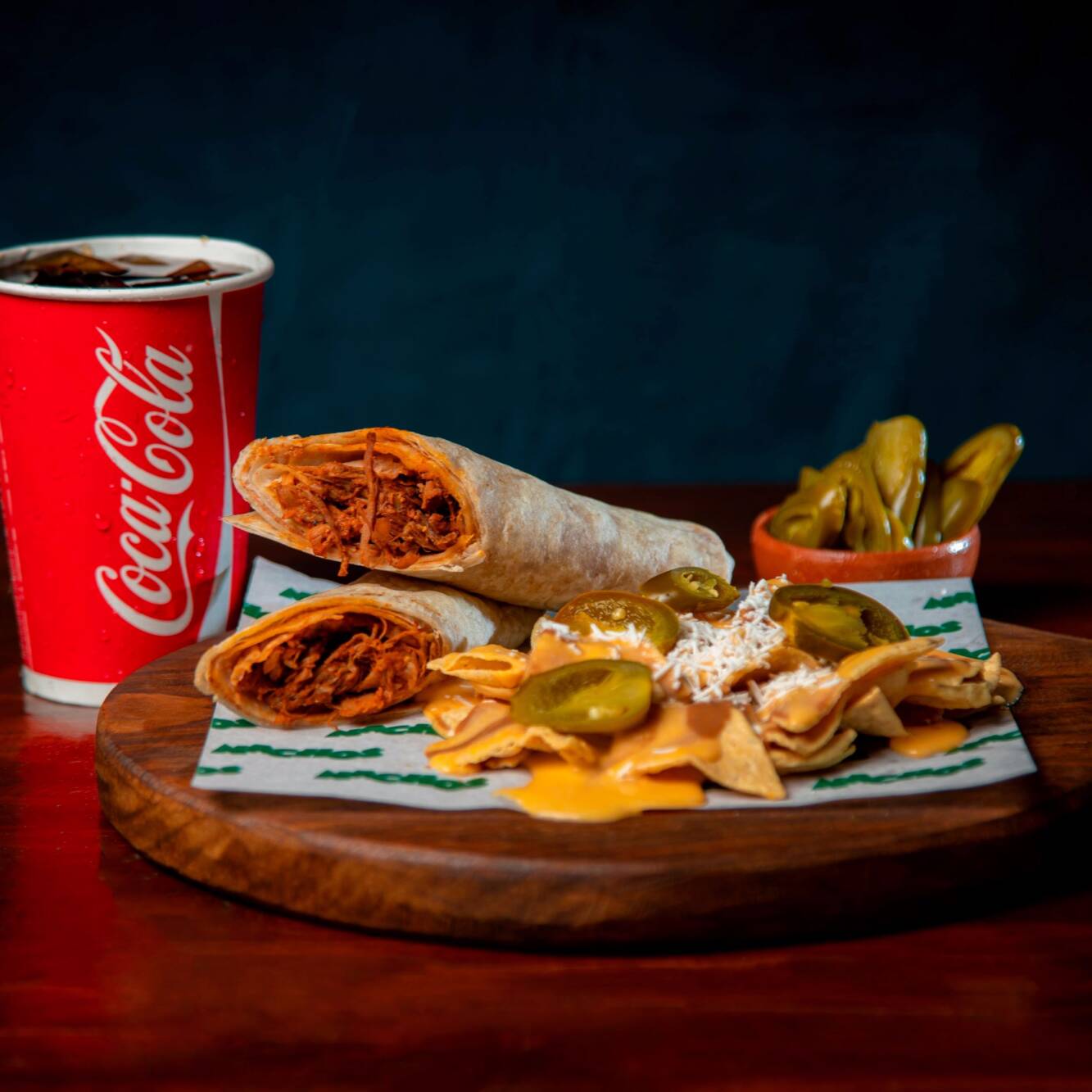 Carne, queso amarillo y refresco. (Sin frijoles)