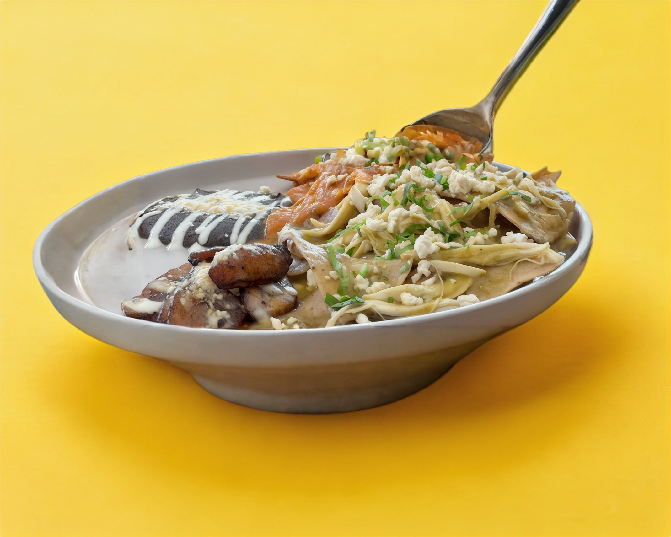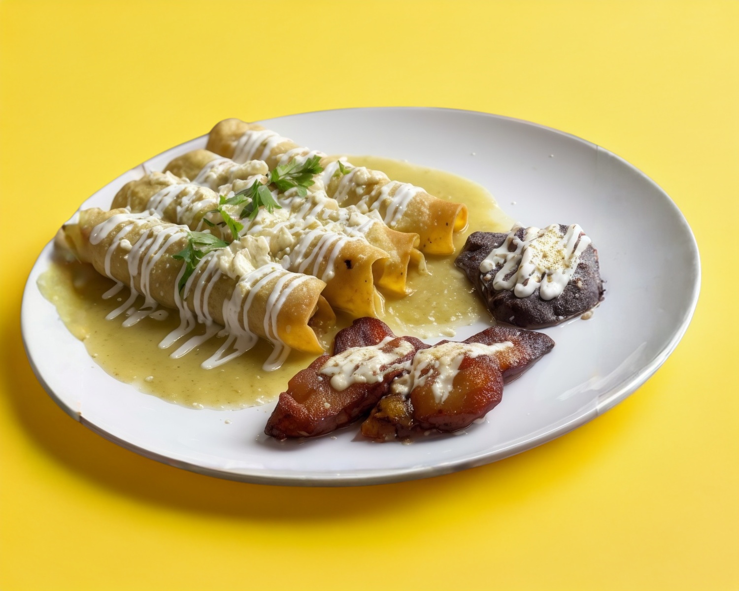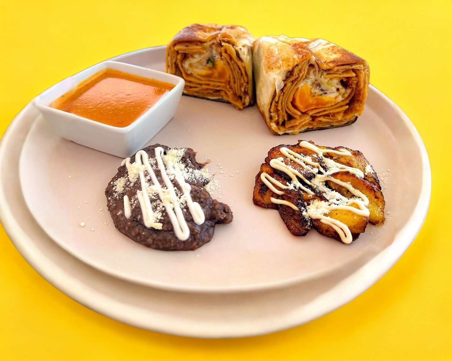 Incluye frijol, plátano frito, crema y queso
