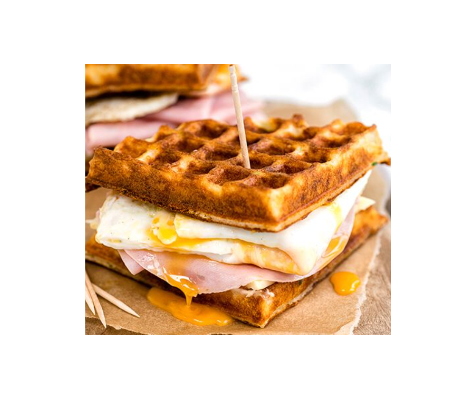 Sandwich de Waffles | Jamon pechuga de pavo | Queso Manchego | 1 Huevo | Tocino| Jarabe de Maple | Papa Hashbrown
