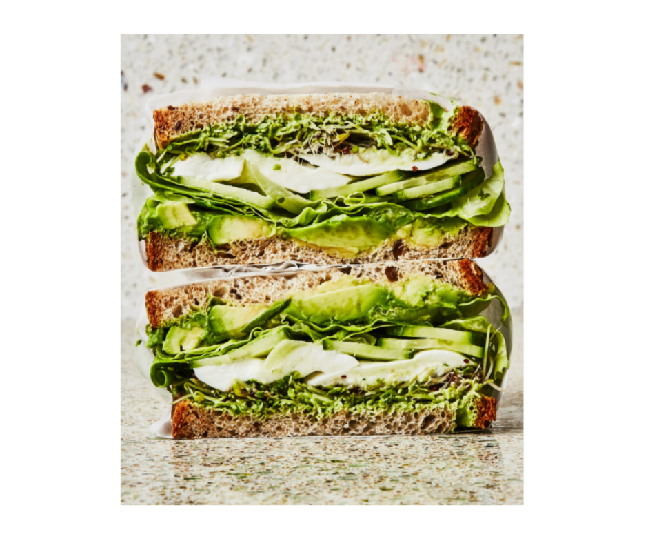 Pan Masa madre | Queso de Cabra| Lechuga| Espinaca | Calabacita asada | Pimiento verde | Aguacate | Pesto|