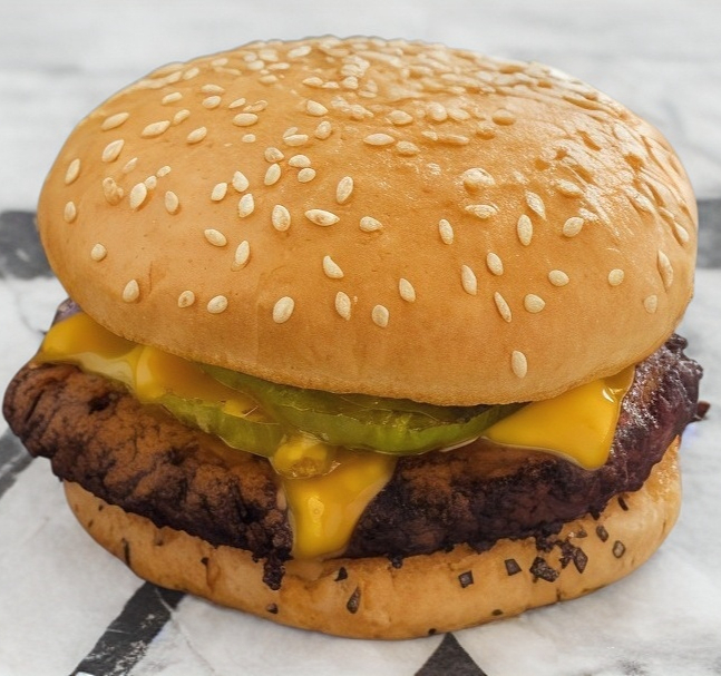 Hamburguesa con carne de res y queso americano.