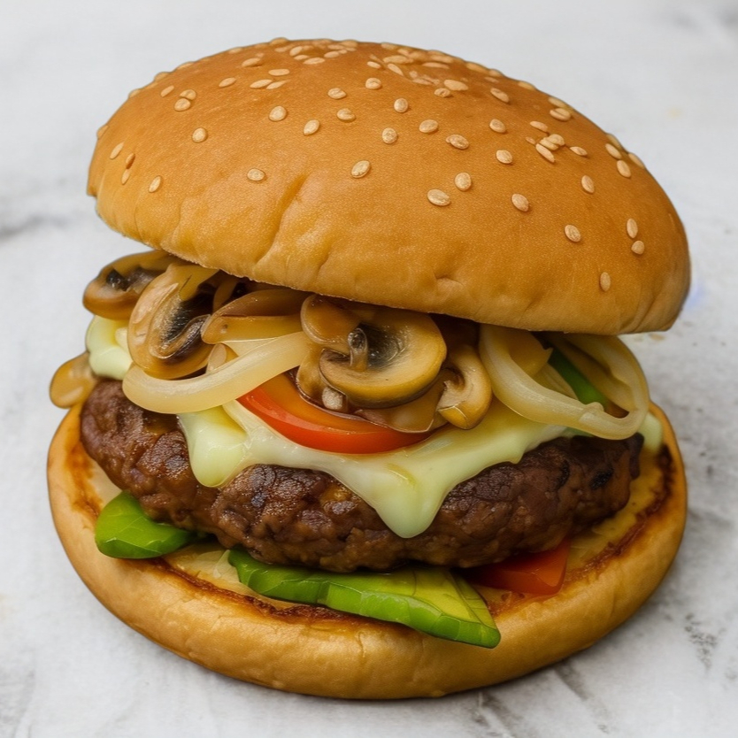 Hamburguesa con carne de res, champiñones, aguacate, queso manchego y cheez whiz.