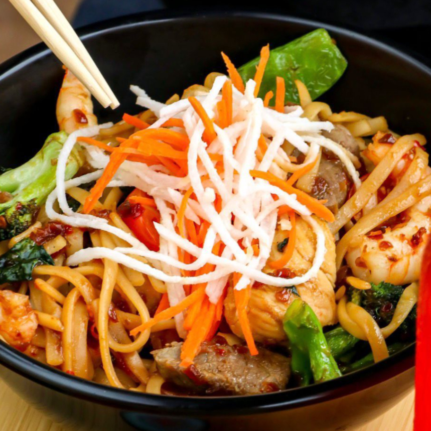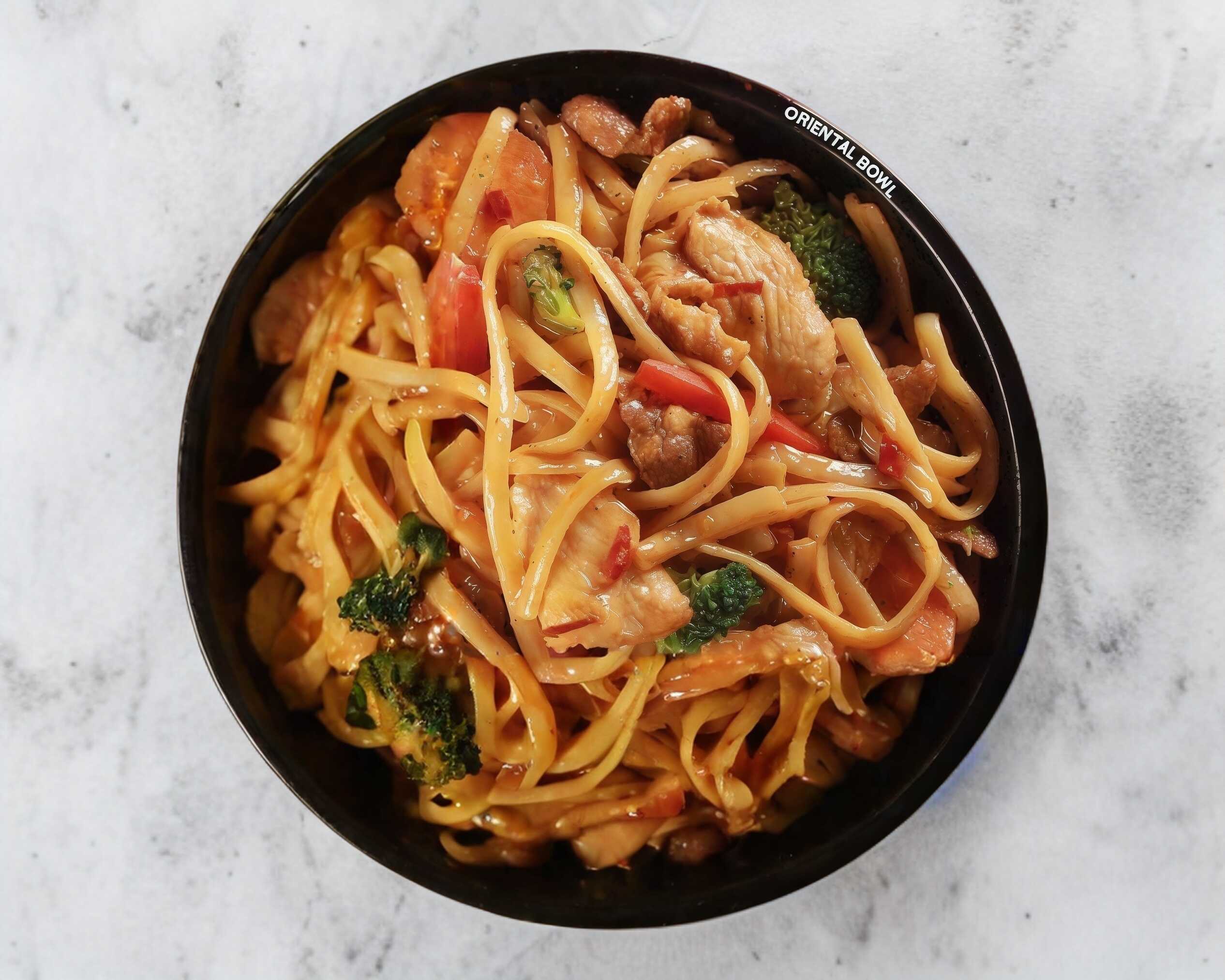 Combinacion de pasta oriental con pollo y carne a la plancha acompañada de brocoli, zanahoria y pimiento rojo, sazonado con nuestra salsa especial de la casa.
