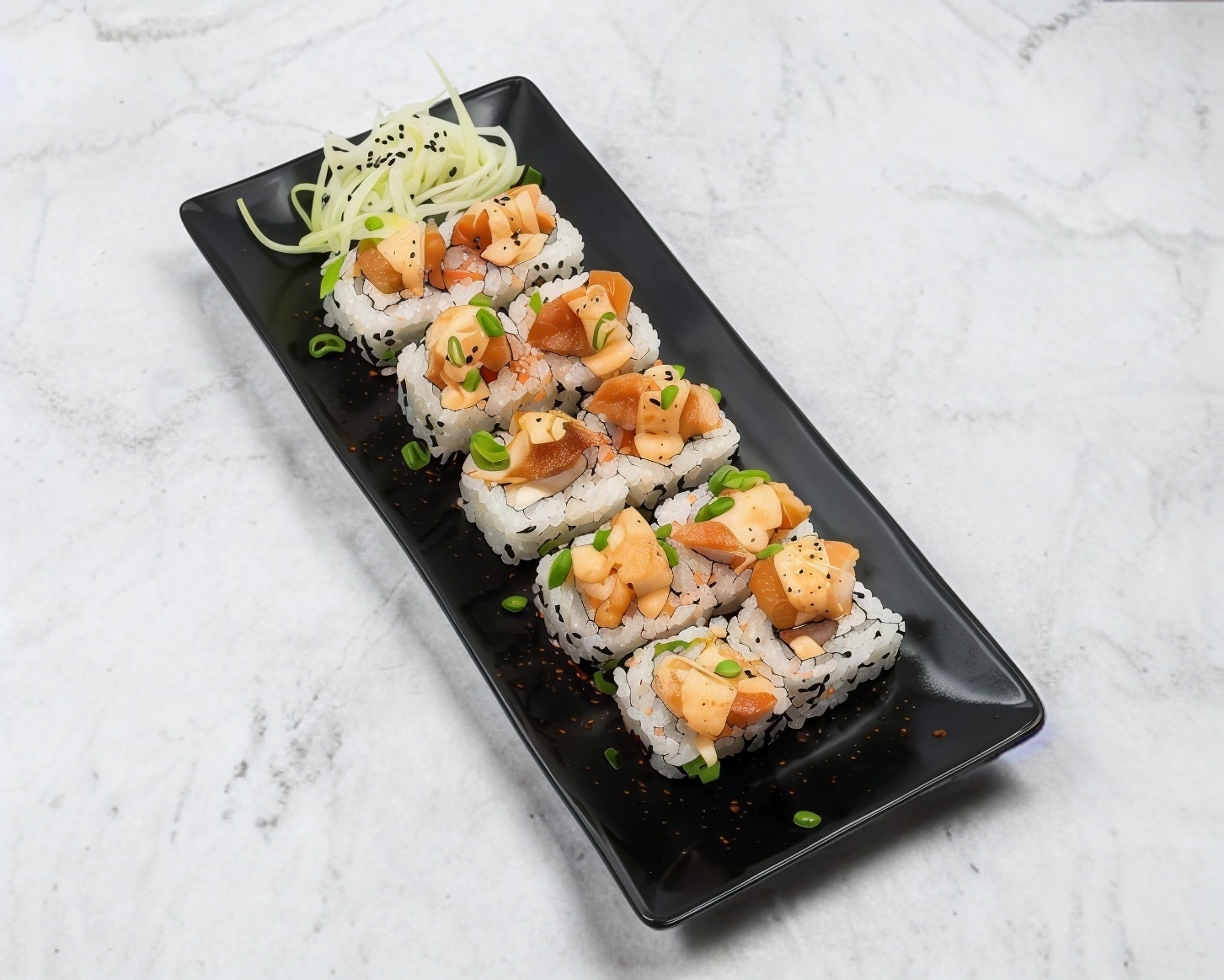 Camarón empanizado, aguacate y queso crema por dentro, con camarón roca, cebollín y ajonjolí por fuera.