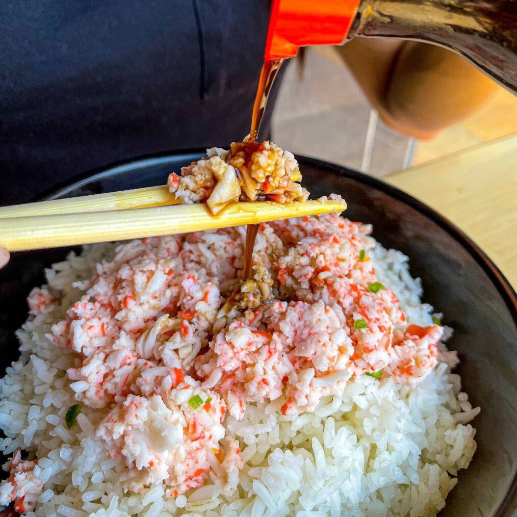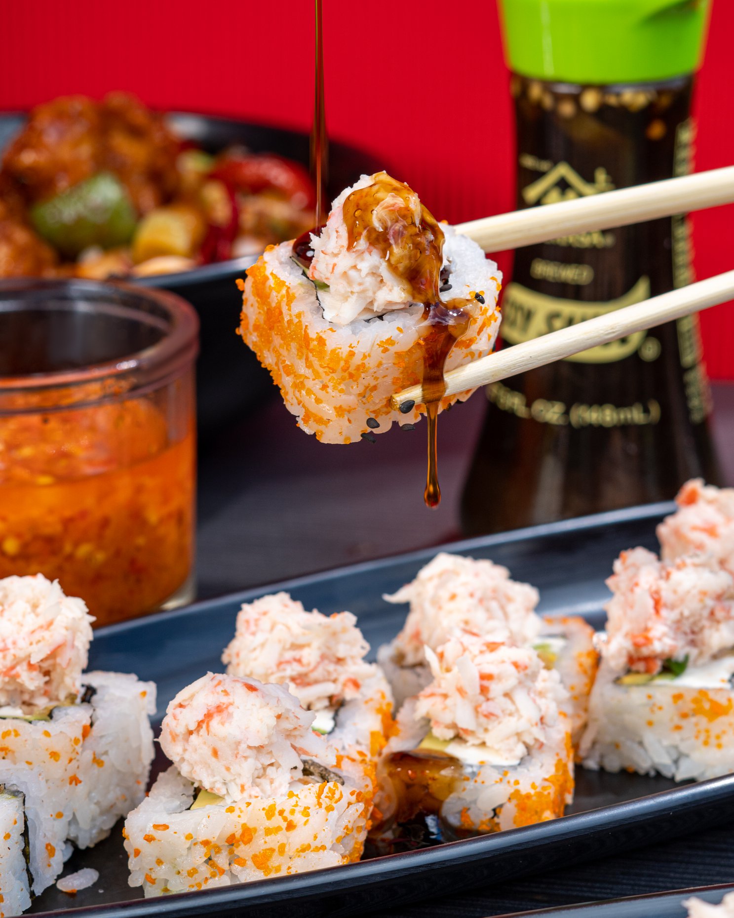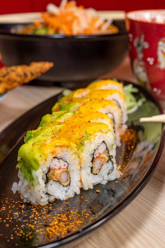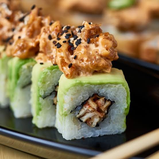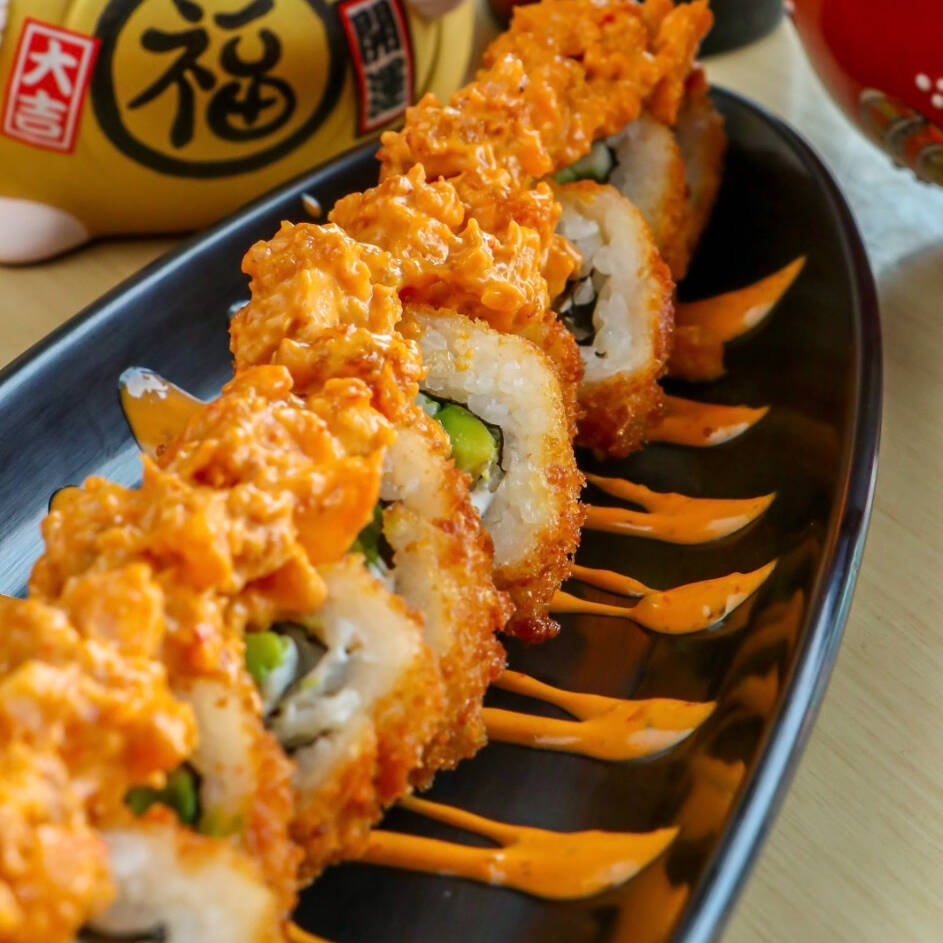 Surimi, pasta crunch y aderezo de chipotle por dentro y por fuera aguacate, pasta crunch, aderezo chipotle, salsa de anguila y ajonjolí.