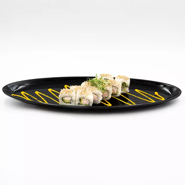 Un rollo con mucho sabor, gracias a su relleno de pasta tampico y forrado con láminas de atún fresco. Y para coronar, aderezo y mermelada de serrano