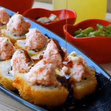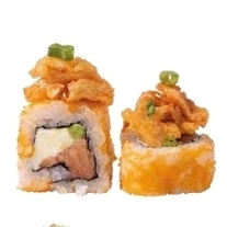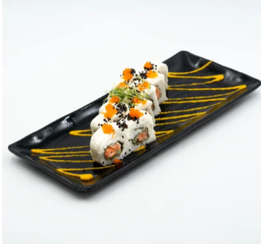 Salmón, queso crema y aguacate por dentro, por fuera masago y una torre de surimi frito mezclado con aderezo roca y decorado con cebollín.