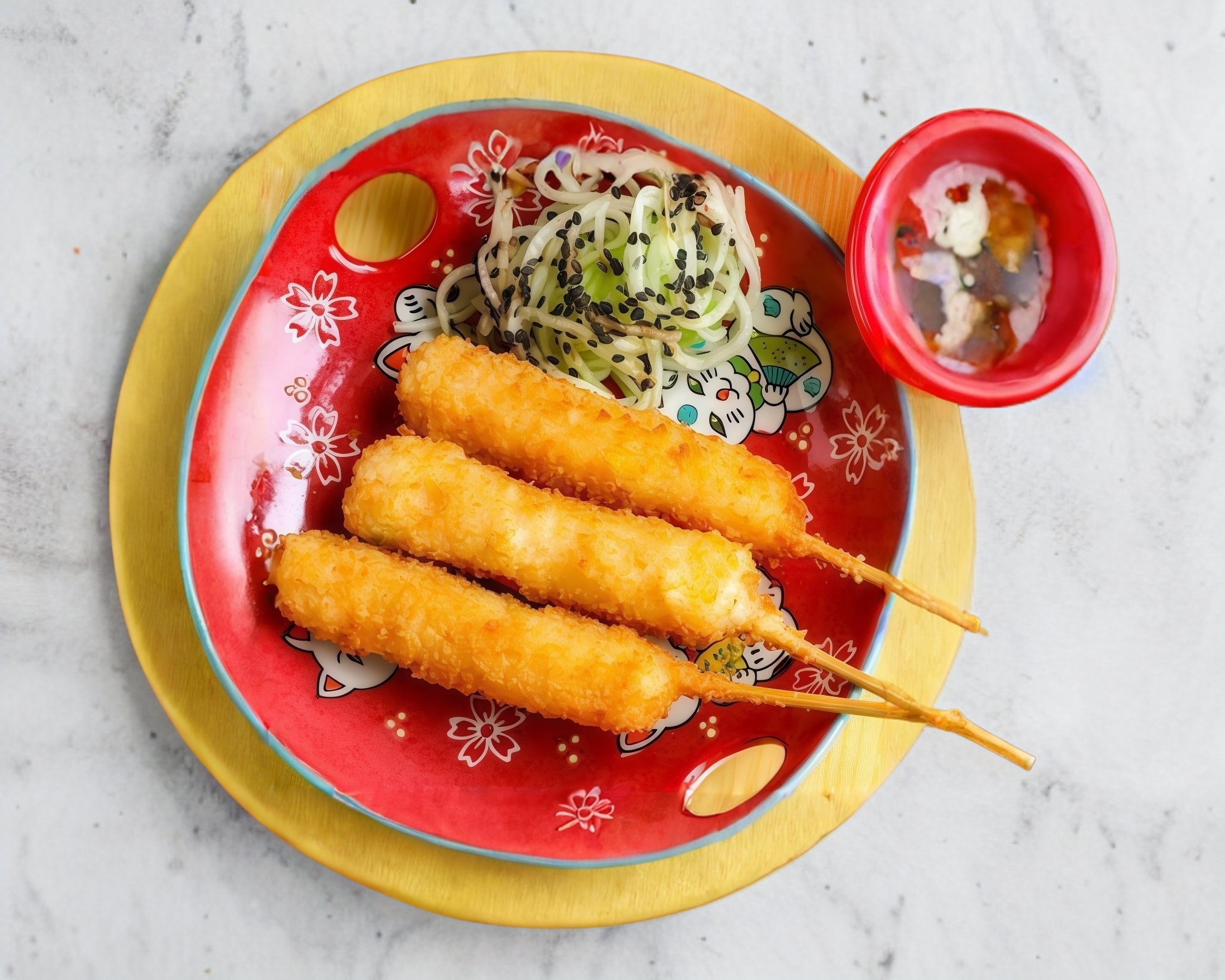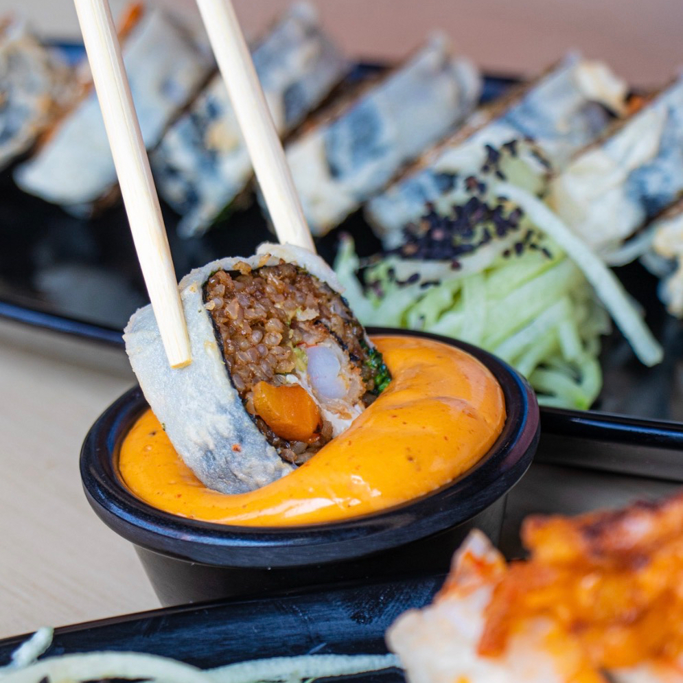 Pasta de surimi, pepino y aguacate por dentro, ajonjolí, dorado por fuera.