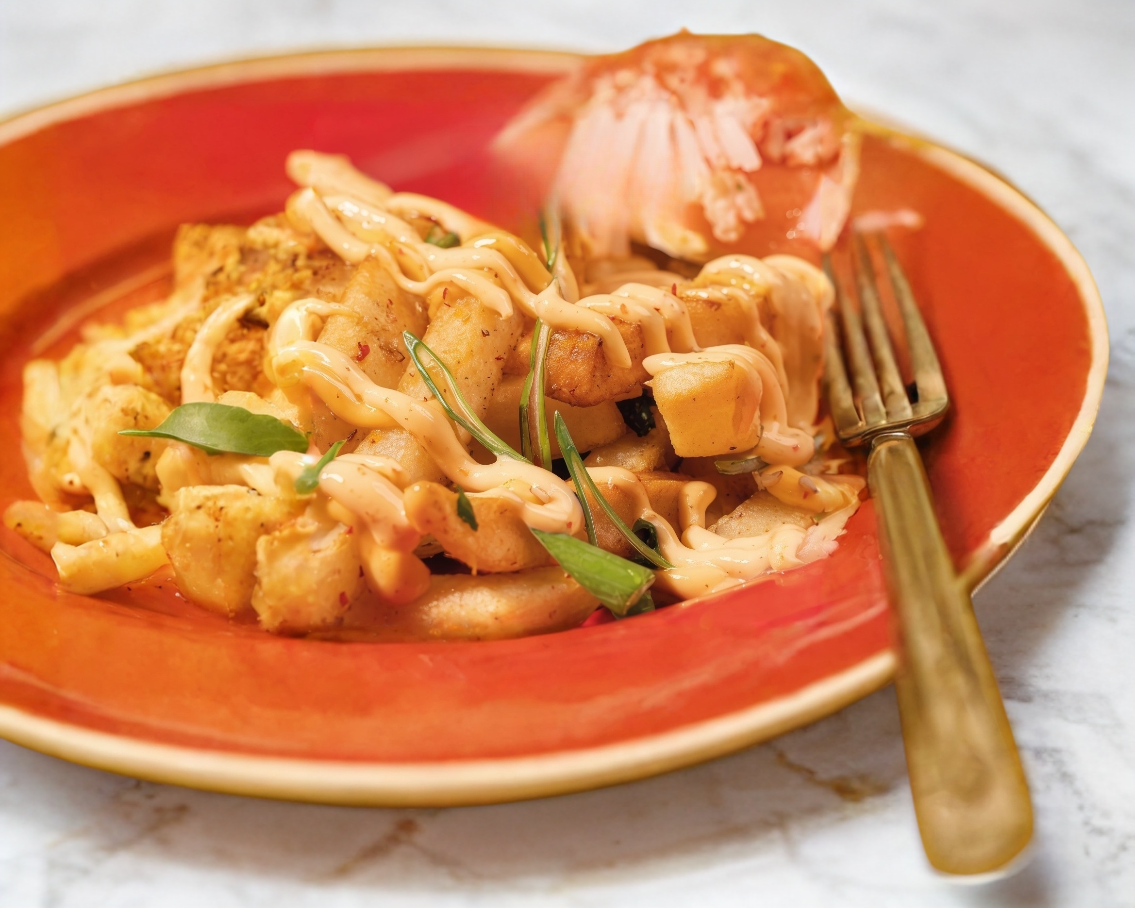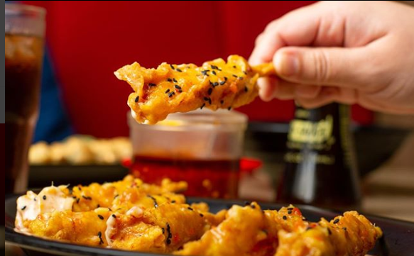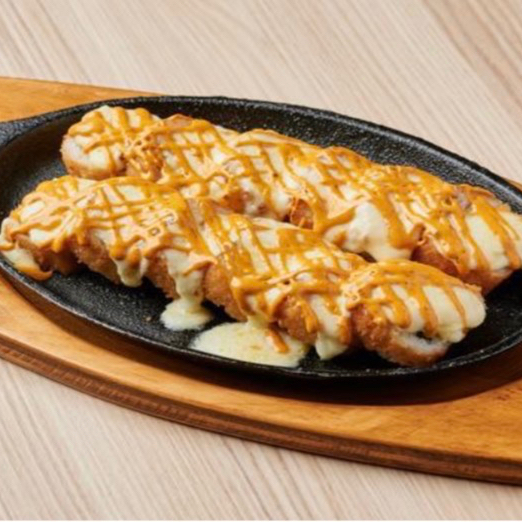 Pollo frito y queso manchego, capeado y bañado en salsa de anguila.