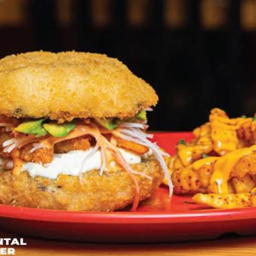 Base de queso crema, delicioso salmon, tampico, kanikama, laminas de aguacate, mayonesa, limon y togarashi, todo entre dos panes hecho a base de arroz empanizado con panko japones (INCLUYE PAPAS SALTEADAS)