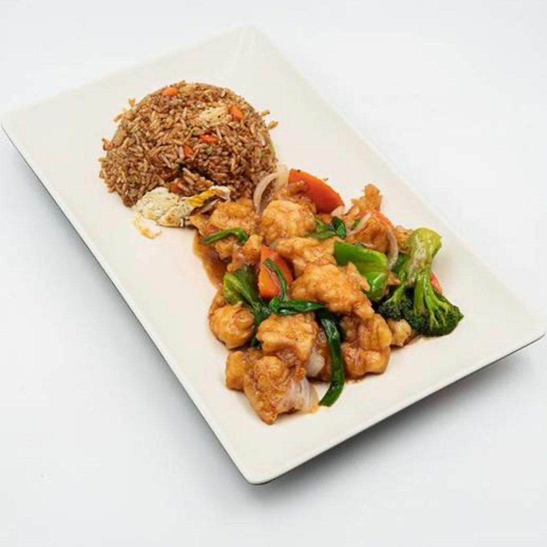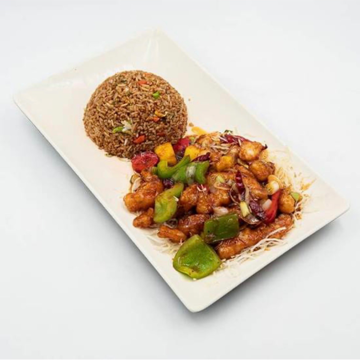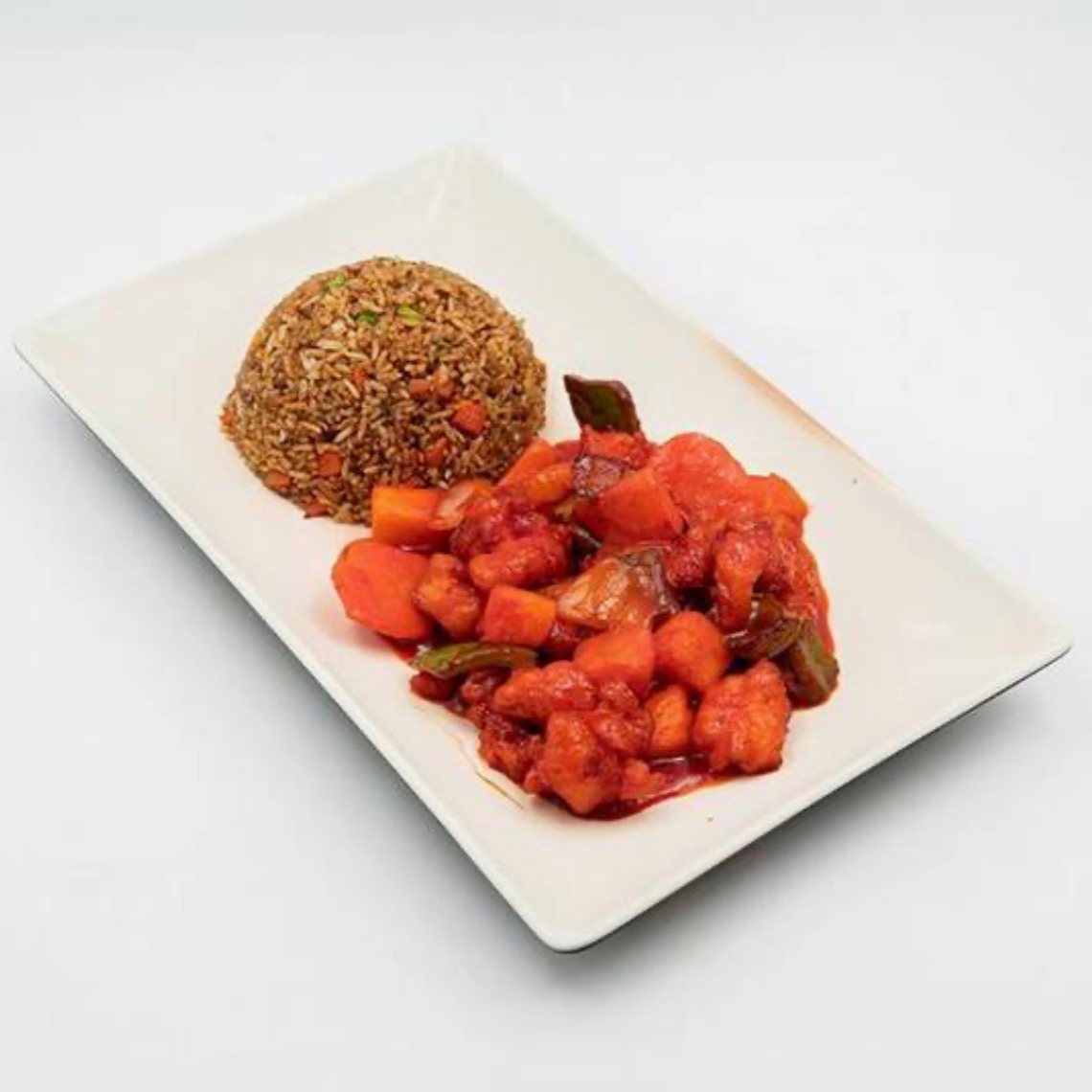 Riquísimo platillo de pollo acompañado de pimiento verde y rojo, piña cebolla cambray y chile de arbol, mezclados con una deliciosa salsa dulces servidos sobre una cama de fideos crujientes.