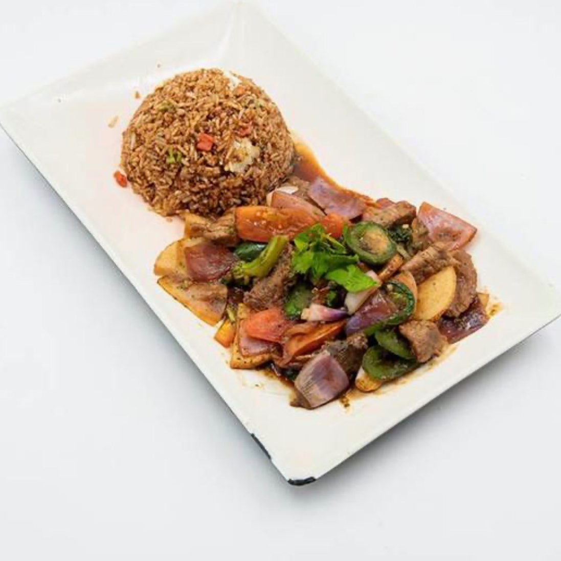 Delicioso salteado de res en una salsa de soya picante acompañado de tomate, cebolla morada, brocoli, jalapeños y papas.
