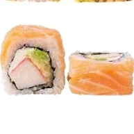 Surimi, queso crema, aguacate y pepino por dentro, decorado con salmón