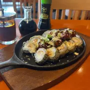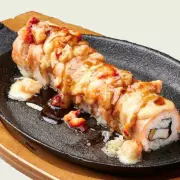 Surimi y aguacate por dentro, cubierto con salmón horneado y gratinado con una mezcla de queso manchego, pulpo y camarón bañado en salsa de anguila.