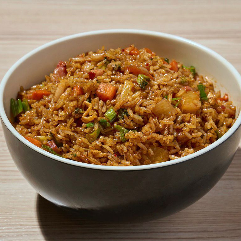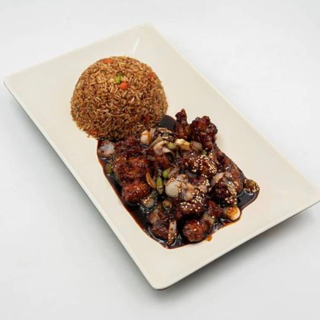 Deliciosa y jugosa carne de res salteada en nuestra suculenta salsa estilo sambal. Acompañada con apio, pimiemto verde, zanahoria y cebolla cambray para un extra crunchen cada mordida,servido sobre de una base de arroz frito o al vapor con ajonjoli para una mayor experiencia de sabores orientales.
