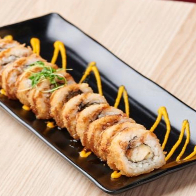Arroz frito, camarón, queso crema y aguacate, capeado y bañado en salsa de anguila.