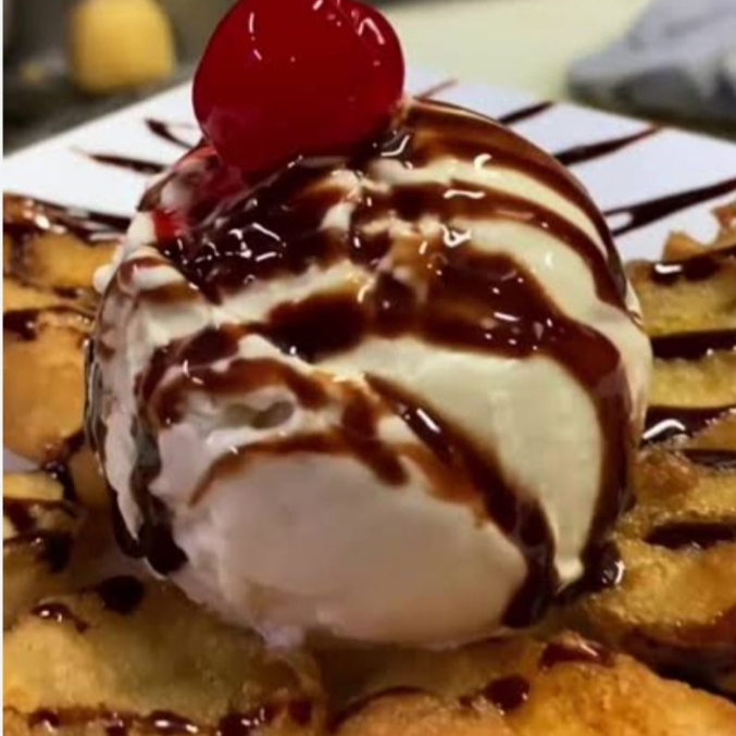 Delicioso helado frito sabor vainilla, acompañado de crema batida con chocolate Hersheys.