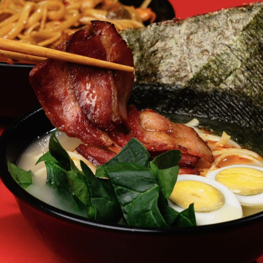 Caldo de puerco. Tocineta crujiente, acompañado de huevo cocido, espinaca, alga dorada y aceite picante.